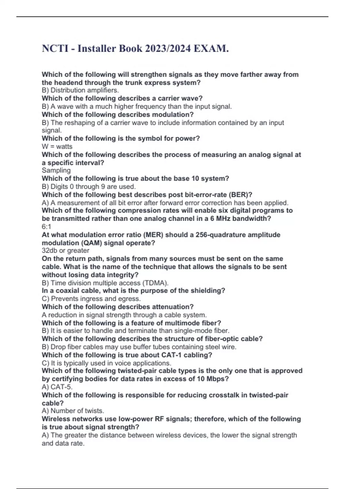 NCTI - Installer Book 2023/2024 EXAM. Which of the following will strengthen signals as they move farther away from the headend through the trunk express system? B) Distribution amplifiers. Which of the following describes a carrier wave? B) A wave with a much higher frequency than the input signal. Which of the following describes modulation? B) The reshaping of a carrier wave to include information contained by an input signal. Which of the following is the symbol for power? W = watts Which of the following describes the process of measuring an analog signal at a specific interval? Sampling Which of the following is true about the base 10 system? B) Digits 0 through 9 are used. Which of the following best describes post bit-error-rate (BER)? A) A measurement of all bit error after forward error correction has been applied. Which of the following compression rates will enable six digital programs to be transmitted rather than one analog channel in a 6 MHz bandwidth? 6:1 At what modulation error ratio (MER) should a 256-quadrature amplitude modulation (QAM) signal operate? 32db or greater On the return path, signals from many sources must be sent on the same cable. What is the name of the technique that allows the signals to be sent without losing data integrity? B) Time division multiple access (TDMA). In a coaxial cable, what is the purpose of the shielding? C) Prevents ingress and egress. Which of the following describes attenuation? A reduction in signal strength through a cable system. Which of the following is a feature of multimode fiber? B) It is easier to handle and terminate than single-mode fiber. Which of the following describes the structure of fiber-optic cable? B) Drop fiber cables may use buffer tubes containing steel wire. Which of the following is true about CAT-1 cabling? C) It is typically used in voice applications. Which of the following twisted-pair cable types is the only one that is approved by certifying bodies for data rates in excess of 10 Mbps? A) CAT-5. Which of the following is responsible for reducing crosstalk in twisted-pair cable? A) Number of twists. Wireless networks use low-power RF signals; therefore, which of the following is true about signal strength? A) The greater the distance between wireless devices, the lower the signal strength and data rate.