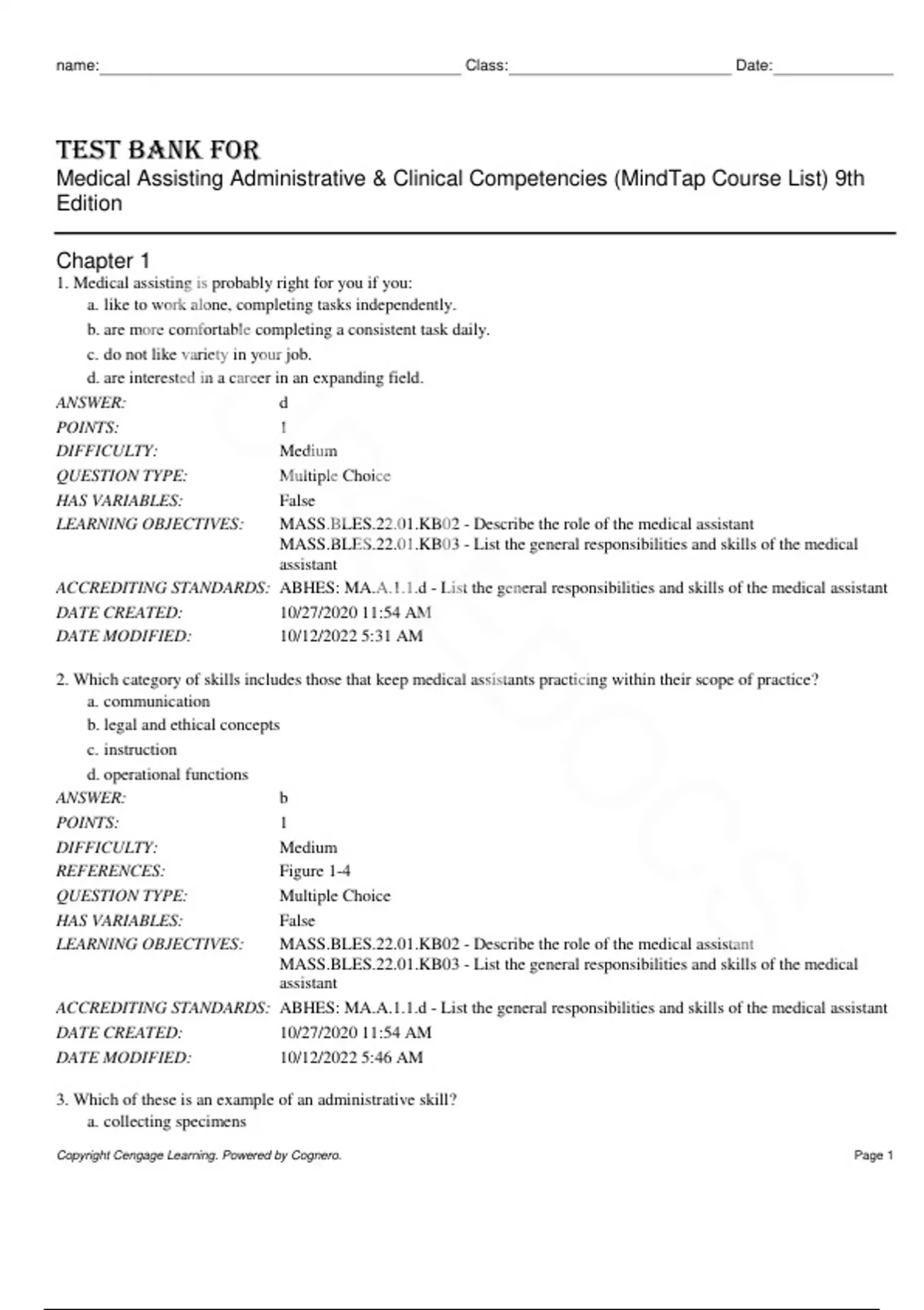 Test Bank for Medical Assisting Administrative & Clinical Competencies (MindTap Course List) 9th Edition by Michelle Blesi Chapter 1-58