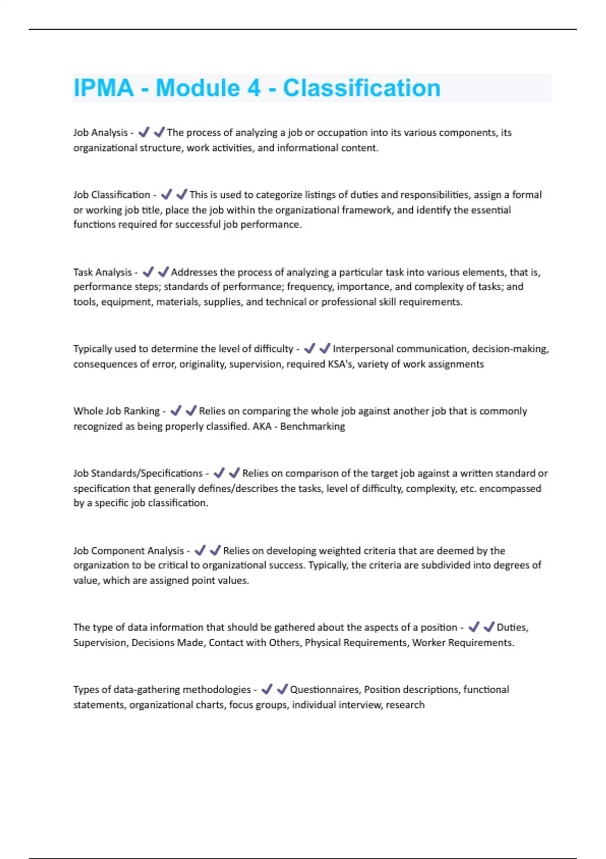 Job Analysis - The process of analyzing a job or occupation into its various components, its organizational structure, work activities, and informational content. Job Classification - This is used to categorize listings of duties and responsibilities, assign a formal or working job title, place the job within the organizational framework, and identify the essential functions required for successful job performance. Task Analysis - Addresses the process of analyzing a particular task into various elements, that is, performance steps; standards of performance; frequency, importance, and complexity of tasks; and tools, equipment, materials, supplies, and technical or professional skill requirements. Typically used to determine the level of difficulty - Interpersonal communication, decision-making, consequences of error, originality, supervision, required KSA's, variety of work assignments Whole Job Ranking - Relies on comparing the whole job against another job that is commonly recognized as being properly classified. AKA - Benchmarking Job Standards/Specifications - Relies on comparison of the target job against a written standard or specification that generally defines/describes the tasks, level of difficulty, complexity, etc. encompassed by a specific job classification. Job Component Analysis - Relies on developing weighted criteria that are deemed by the organization to be critical to organizational success. Typically, the criteria are subdivided into degrees of value, which are assigned point values. The type of data information that should be gathered about the aspects of a position - Duties, Supervision, Decisions Made, Contact with Others, Physical Requirements, Worker Requirements. Types of data-gathering methodologies - Questionnaires, Position descriptions, functional statements, organizational charts, focus groups, individual interview, researchWhen conducting audit with employee - Place employee at ease, the tone should be conversational and informal, the interview should be conducted at the employee's worksite, explain the purpose of the interview Job Standards/Specifications - A generalized description of a group of jobs, that for classification purposes, have the same title. When developing job standards include the following: - Class Title and numeric code, class definition, examples of work, special requirements, experience and training experience, and KSA's. Class Title and Numeric Code - The title expressive of the generic occupation of work and the code would distinguish each class in the job family. Class definition - Describes all of the critical factors that distinguish this specific class title from all other job titles Examples of work - Examples of work actually performed, action statements that depict work, representative statements of work normally performed at that level. Knowledge, Skills and Abilities - Information concerning facts, principles, procedures, rules. laws, or processes that is possessed in a manner that can be evaluated or tested. The capability of using knowledge with competency. Involves the proficient use of knowledge, or proficiency in a motor or physical work environment. Experience and Training requirements - Includes the minimum experience, education, and/or training which and applicant must possess. Necessary Special Requirements - Examples would be licensure, certification, or registration. Duties Test - Involves determining whether the job falls into one of the three categories: Executive, Professional, Administrative.Salary level and basis test - If an employee makes less than $23,600 per year, or $455 per week the job is non-exempt. Executive jobs duties typically include - Regularly supervises two or more employees and has management as the primary duty of the position. Has genuine input into the job status of other employees, which includes activities such as hiring, terminating, etc.