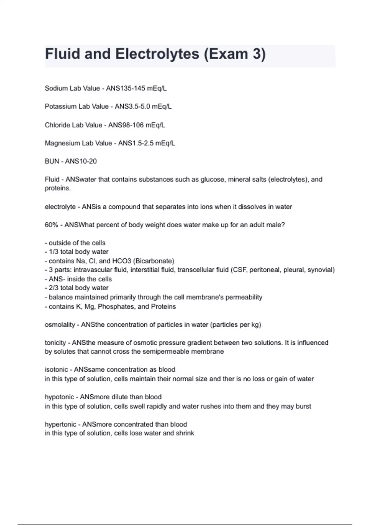 - 3 parts: intravascular fluid, interstitial fluid, transcellular fluid (CSF, peritoneal, pleural, synovial)