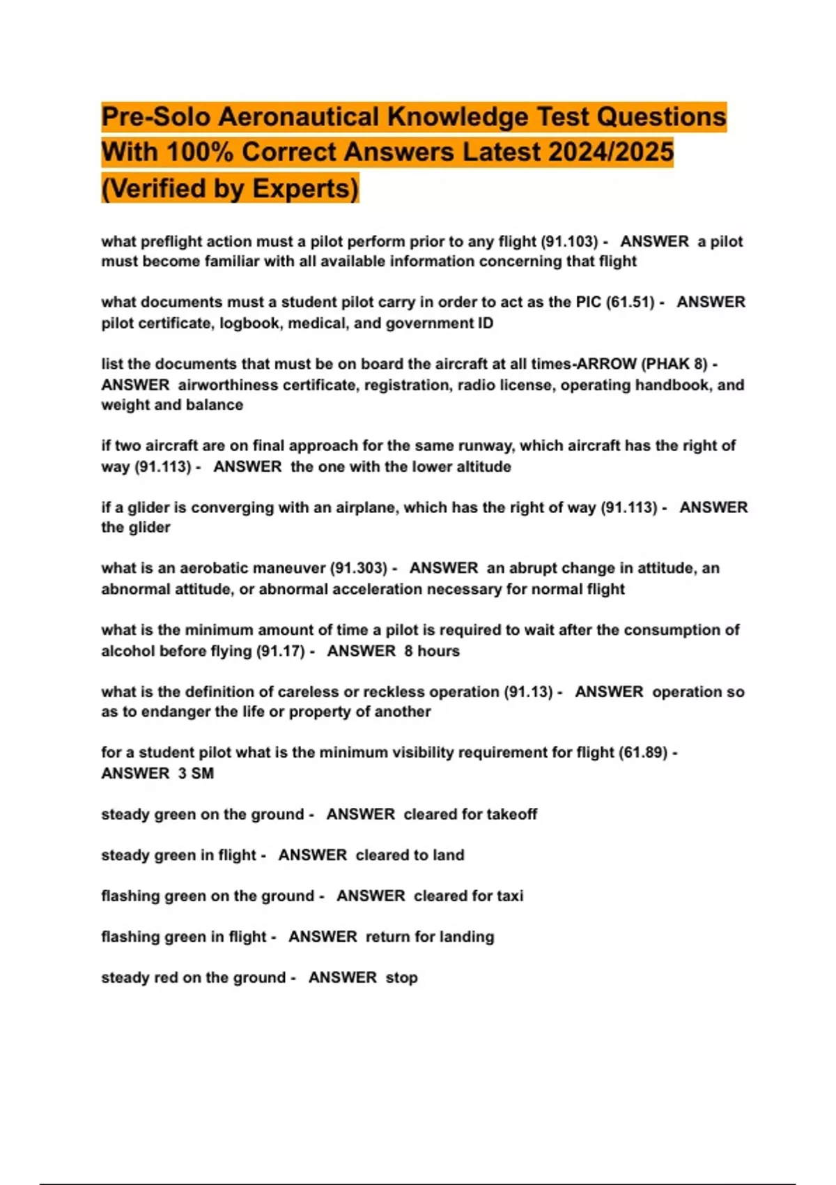 Pre-Solo Aeronautical Knowledge Test Questions With 100% Correct Answers Latest 2024/2025 (Verified by Experts)