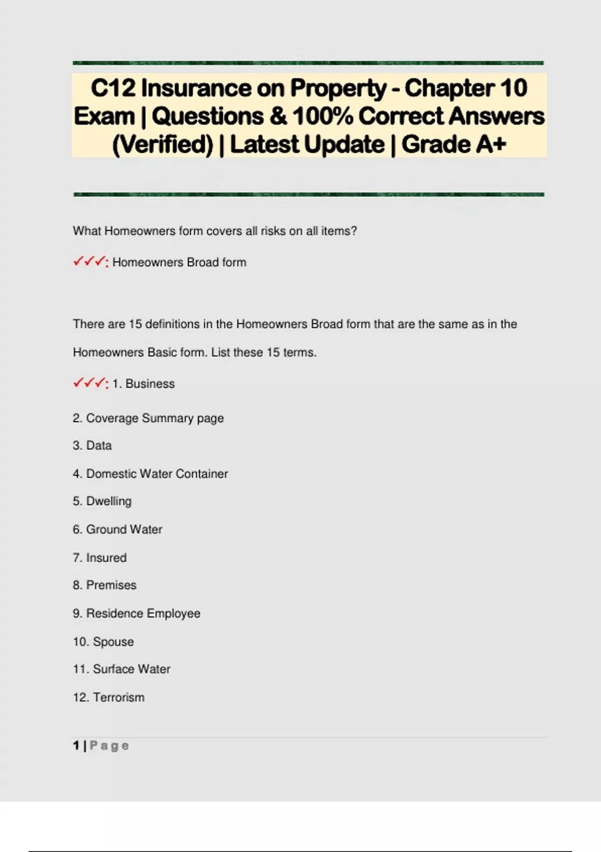 C12 Insurance on Property - Chapter 10 Exam | Questions & 100% Correct Answers (Verified) | Latest Update | Grade A+