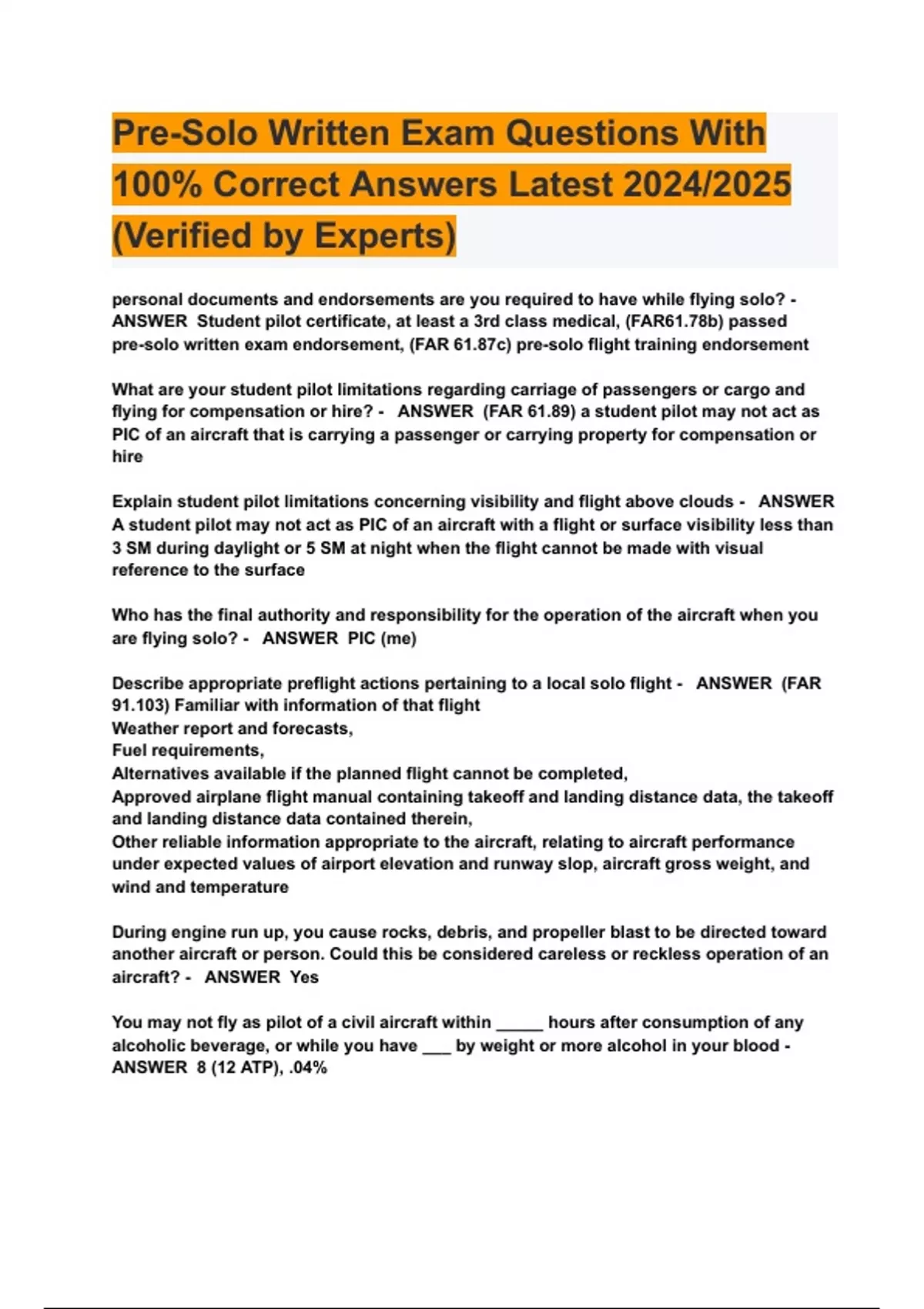 Pre-Solo Written Exam Questions With 100% Correct Answers Latest 2024/2025 (Verified by Experts)