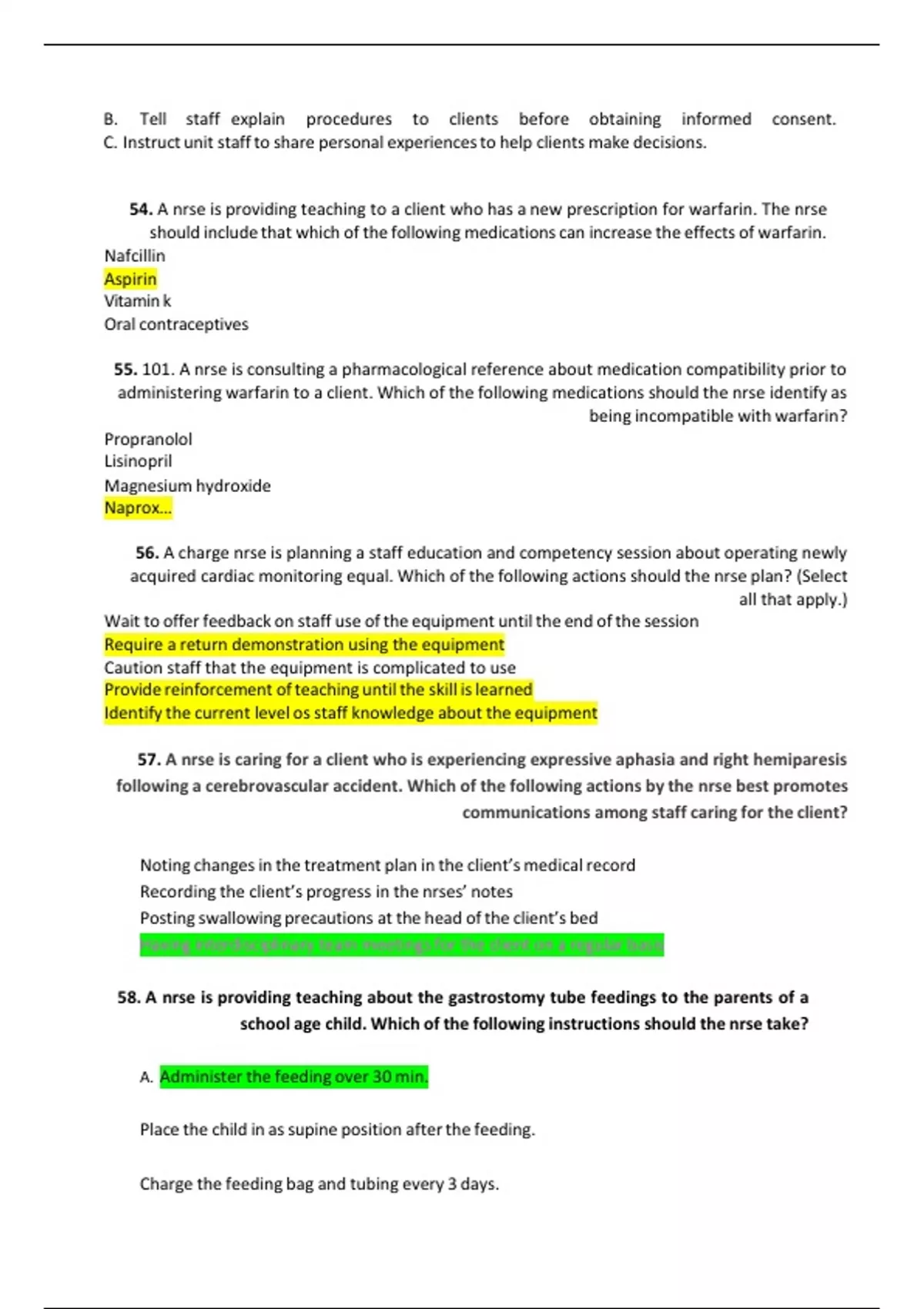 Which is the most common cause of symptomatic hypomagnesemia? Intravenous drug use Alcoholism Sedentary lifestyle Burns-ANSWER Alcoholism You are caring for a client with severe hypokalemia. The physician has ordered IV potassium to be administered at 10 mEq/hr. The client complains of burning along their vein. What should you do? Dilute the infusion. Switch to an oral formulation. Increase the speed of transfusion. Change the electrolyte.-ANSWER Dilute the infusion. **Oral potassium may not be enough in severe cases hypokalemia.** Treatment of severe hypokalemia requires treatment with IV infusion of potassium. Clients may experience burning along the vein with IV infusion of potassium in proportion to the infusion's concentration. If the client can tolerate the fluid, consult with the physician about diluting the potassium in a larger volume of IV solution. Hypokalemia requires treatment with potassium and not any other electrolyte. Which laboratory result does the nurse identify as a direct result of the client's hypovolemic status with hemoconcentration? Abnormal potassium level Elevated hematocrit level Low white blood count Low urine specific gravity-ANSWER Elevated hematocrit level When hemoconcentration occurs due to a hypovolemic state, a high ratio of blood components in relation to watery plasma occurs, thus causing an elevated hematocrit level.
