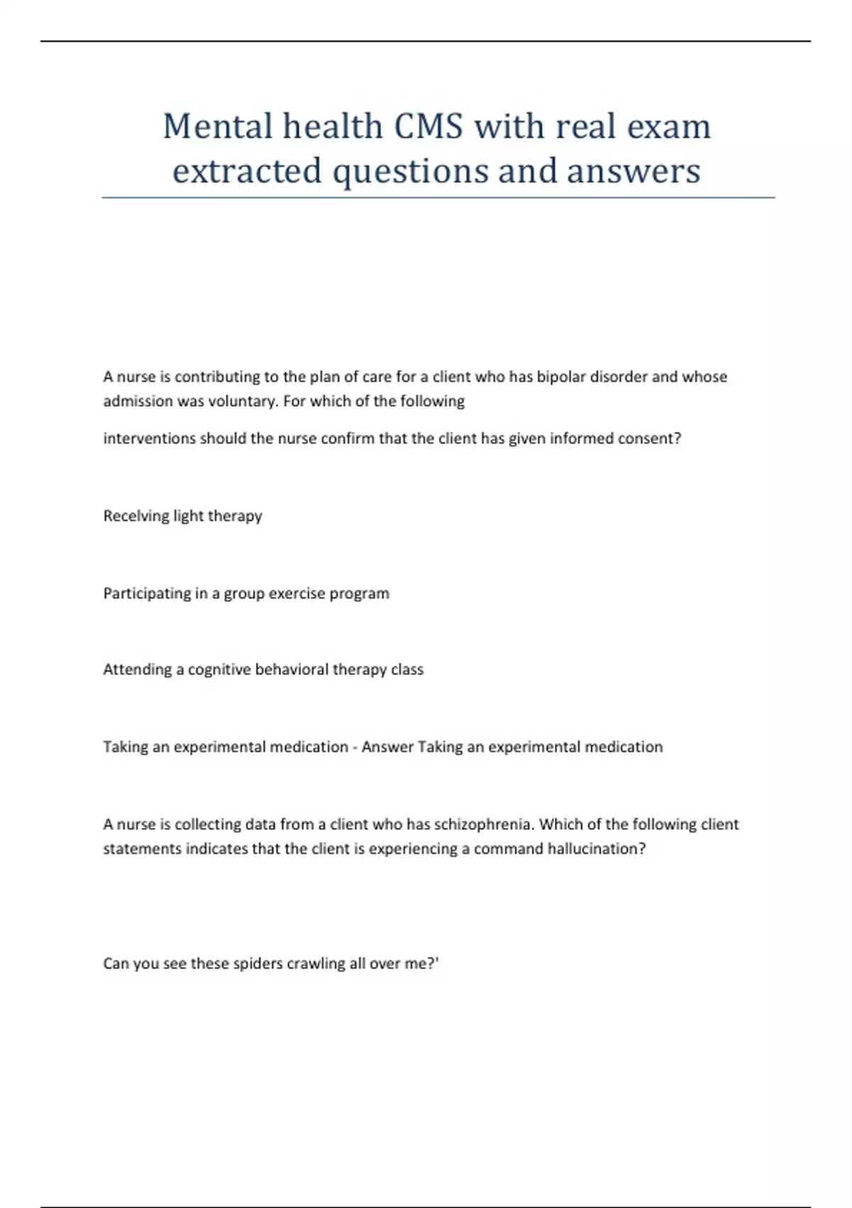 Mental health CMS with real exam extracted questions and answers