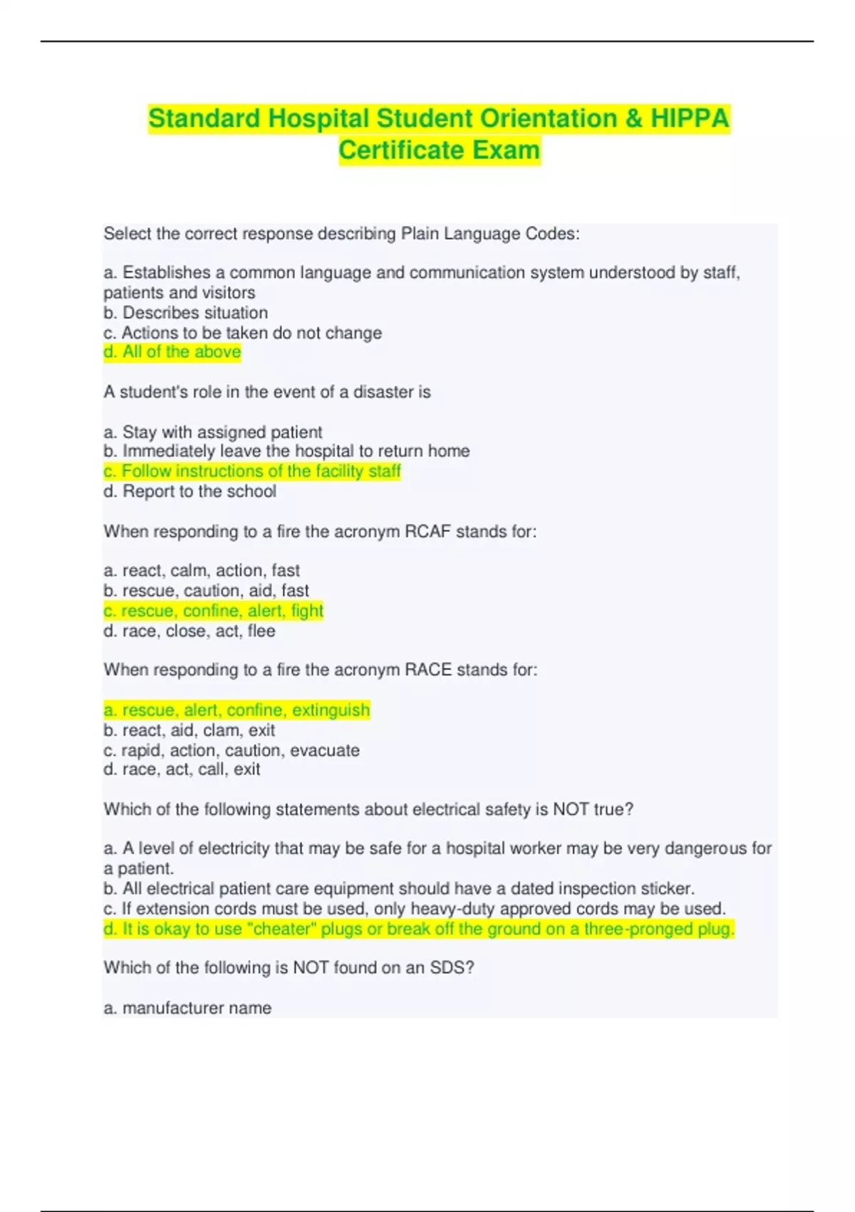 Standard Hospital Student Orientation & HIPPA Certificate Exam - Q & A Select the correct response describing Plain Language Codes: a. Establishes a common language and communication system understood by staff, patients and visitors b. Describes situation c. Actions to be taken do not change d. All of the above A student's role in the event of a disaster is a. Stay with assigned patient b. Immediately leave the hospital to return home c. Follow instructions of the facility staff d. Report to the school When responding to a fire the acronym RCAF stands for: a. react, calm, action, fast b. rescue, caution, aid, fast c. rescue, confine, alert, fight d. race, close, act, flee When responding to a fire the acronym RACE stands for: a. rescue, alert, confine, extinguish b. react, aid, clam, exit c. rapid, action, caution, evacuate d. race, act, call, exit Which of the following statements about electrical safety is NOT true? a. A level of electricity that may be safe for a hospital worker may be very dangerous for a patient. b. All electrical patient care equipment should have a dated inspection sticker. c. If extension cords must be used, only heavy-duty approved cords may be used. d. It is okay to use "cheater" plugs or break off the ground on a three-pronged plug. Which of the following is NOT found on an SDS? a. manufacturer name b. precautions for safe use c. first aid procedures d. location of the product Which of the following is NOT one of the four diseases most likely to occur as a result of bioterrorism? a. Anthrax b. Chickenpox c. Plague d. Botulism Indicate whether the following statement about bioterrorism is TRUE or FALSE: if you find a suspicious item, the item and/or the area should be left untouched, doors closed to prevent others from entering the area, hands or exposed areas washed with soap and water, and notify you supervisor and instructor immediately. a. True b. False An injury resulting from a medical intervention and not due to the underlying condition of a patient is called a(n): a. Sentinel event b. Error c. Adverse event d. Incident Unanticipated death, infant abduction, rape of a patient, major permanent loss of function, and hemolytic transfusion reaction are all examples of a(n): a. Sentinel event b. Error c. Adverse event d. Incident Which of the following is NOT an acceptable response when patient care equipment is known or suspected of being unsafe or not functioning properly? a. remove equipment from immediate work area b. place a "DO NOT USE" sign on the equipment c. contact the unit supervisor immediately d. unplug the equipment and leave it in the patient's room What kinds of needles can cause needlestick injuries? a. Hypodermic needles b. Blood collection needles c. Suture needles d. Needles used in IV delivery systems e. All of the above