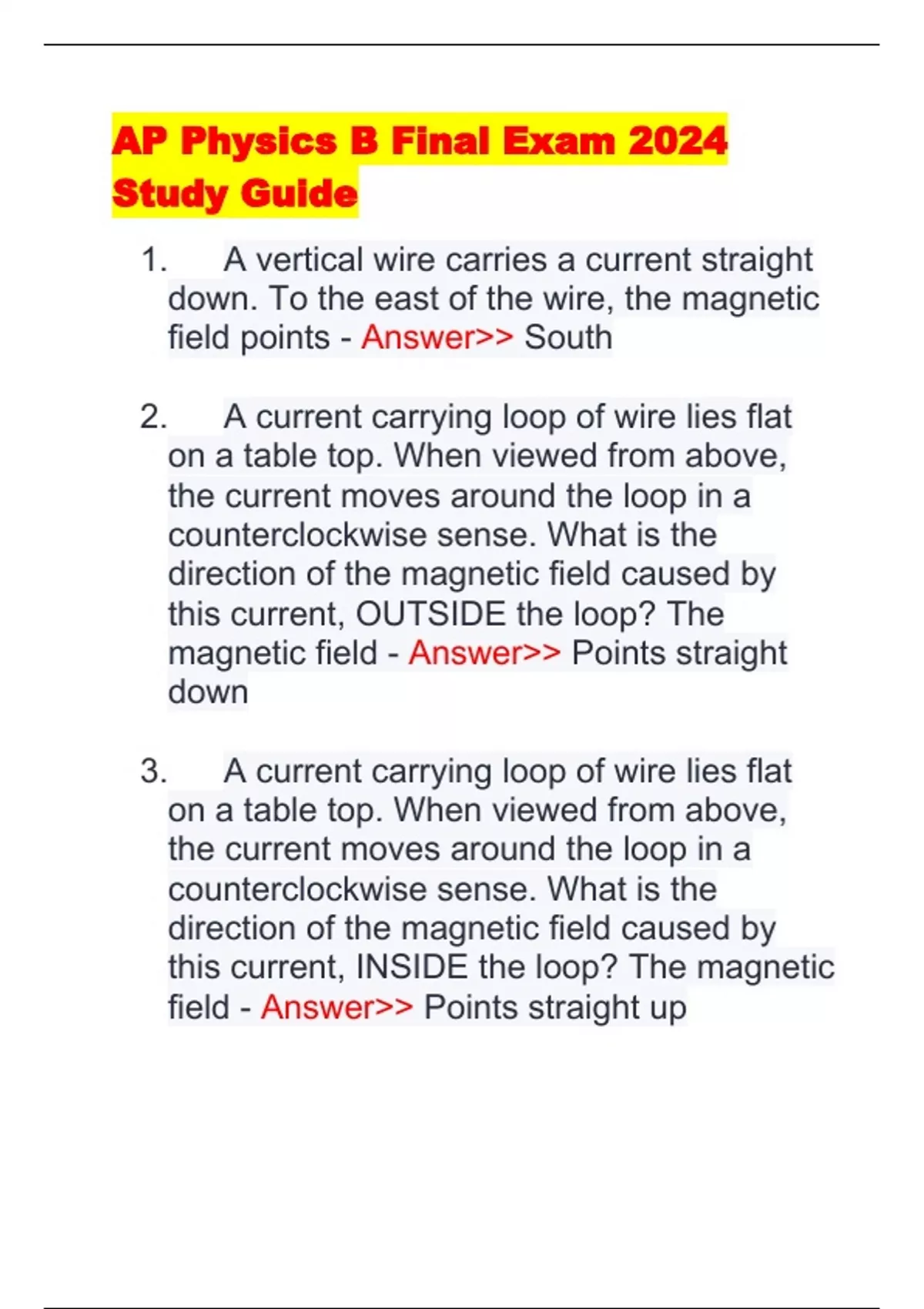 AP Physics B Final Exam 2024 Study Guide 1. A vertical wire carries a current straight down. To the east of the wire, the magnetic field points - Answer>> South 2. A current carrying loop of wire lies flat on a table top. When viewed from above, the current moves around the loop in a counterclockwise sense. What is the direction of the magnetic field caused by this current, OUTSIDE the loop? The magnetic field - Answer>> Points straight down
