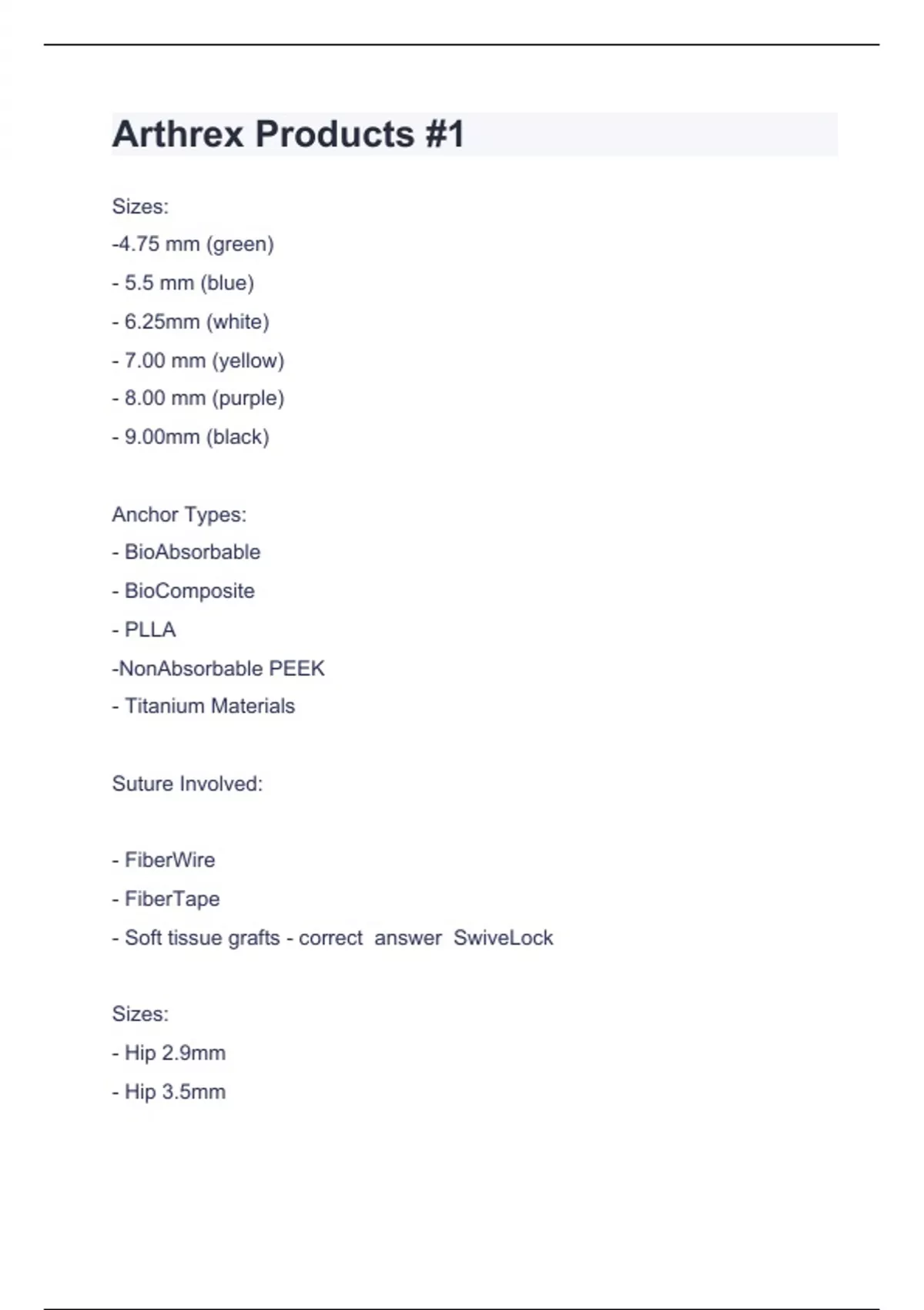Arthrex Products Question and answers correctly solved 2024 Arthrex Products #1 Sizes: -4.75 mm (green) - 5.5 mm (blue) - 6.25mm (white) - 7.00 mm (yellow) - 8.00 mm (purple) - 9.00mm (black) Anchor Types: - BioAbsorbable - BioComposite - PLLA -NonAbsorbable PEEK - Titanium Materials Suture Involved: - FiberWire - FiberTape - Soft tissue grafts - correct answer SwiveLock Sizes: - Hip 2.9mm - Hip 3.5mm - Mini Hip 2.4