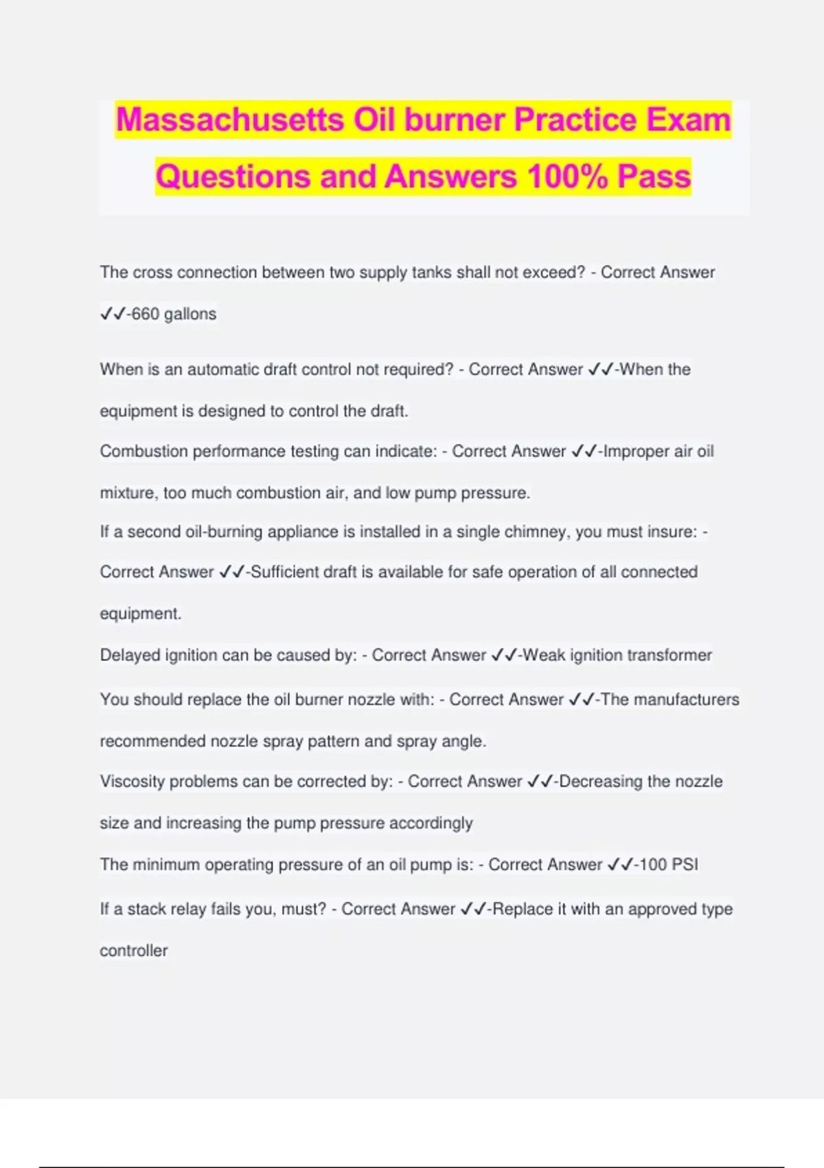 Massachusetts Oil burner Practice Exam Questions and Answers 100% Pass The cross connection between two supply tanks shall not exceed? - Correct Answer ✔️✔️-660 gallons When is an automatic draft control not required? - Correct Answer ✔️✔️-When the equipment is designed to control the draft. Combustion performance testing can indicate: - Correct Answer ✔️✔️-Improper air oil mixture, too much combustion air, and low pump p ressure. If a second oil -burning appliance is installed in a single chimney, you must insure: - Correct Answer ✔️✔️-Sufficient draft is available for safe operation of all connected equipment. Delayed ignition can be caused by: - Correct Answer ✔️✔️-Weak i gnition transformer You should replace the oil burner nozzle with: - Correct Answer ✔️✔️-The manufacturers recommended nozzle spray pattern and spray angle. Viscosity problems can be corrected by: - Correct Answer ✔️✔️-Decreasing the nozzle size and increa sing the pump pressure accordingly The minimum operating pressure of an oil pump is: - Correct Answer ✔️✔️-100 PSI If a stack relay fails you, must? - Correct Answer ✔️✔️-Replace it with an approved type controller Aquastats are normally found on what type of heating systems? - Correct Answer ✔️✔️-