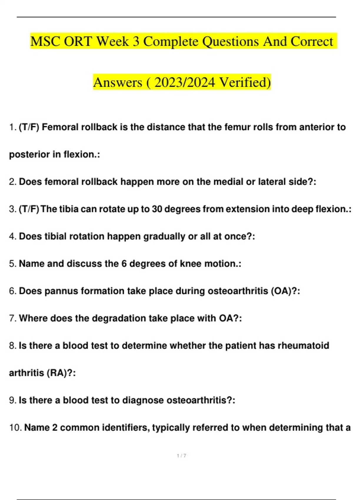MSC ORT Week 3 Complete Questions And Answers | 2023/2024 Verified Quiz