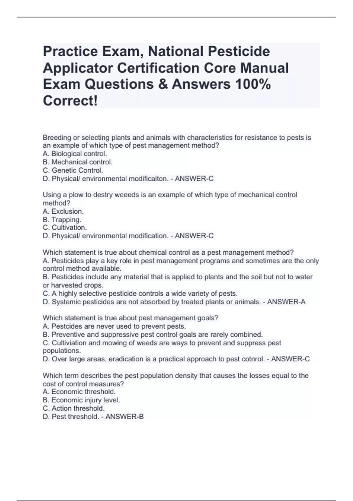 Breeding or selecting plants and animals with characteristics for resistance to pests is an example of which type of pest management method? A. Biological control. B. Mechanical control. C. Genetic Control. D. Physical/ environmental modificaiton. - ANSWER-C Using a plow to destry weeeds is an example of which type of mechanical control method? A. Exclusion. B. Trapping. C. Cultivation. D. Physical/ environmental modification. - ANSWER-C Which statement is true about chemical control as a pest management method? A. Pesticides play a key role in pest management programs and sometimes are the only control method available. B. Pesticides include any material that is applied to plants and the soil but not to water or harvested crops. C. A highly selective pesticide controls a wide variety of pests. D. Systemic pesticides are not absorbed by treated plants or animals. - ANSWER-A Which statement is true about pest management goals? A. Pestcides are never used to prevent pests. B. Preventive and suppressive pest control goals are rarely combined. C. Cultiviation and mowing of weeds are ways to prevent and suppress pest populations. D. Over large areas, eradication is a practical approach to pest cotnrol. - ANSWER-C Which term describes the pest population density that causes the losses equal to the cost of control measures? A. Economic threshold. B. Economic injury level. C. Action threshold. D. Pest threshold. - ANSWER-B Which would decrease the likelihood of pesticide resistance? A. Increasing label dosages. B. Using pesticides from the same class of chemicals. C. Applying the pesticide over a wide area. D. Using pesticides with multiple sites of toxicity in an organism. - ANSWER-D