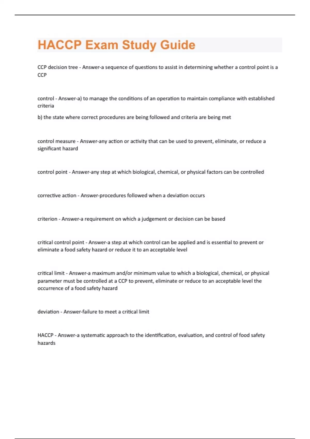CCP decision tree - Answer-a sequence of questions to assist in determining whether a control point is a CCP control - Answer-a) to manage the conditions of an operation to maintain compliance with established criteria b) the state where correct procedures are being followed and criteria are being met control measure - Answer-any action or activity that can be used to prevent, eliminate, or reduce a significant hazard control point - Answer-any step at which biological, chemical, or physical factors can be controlled corrective action - Answer-procedures followed when a deviation occurs criterion - Answer-a requirement on which a judgement or decision can be based critical control point - Answer-a step at which control can be applied and is essential to prevent or eliminate a food safety hazard or reduce it to an acceptable level critical limit - Answer-a maximum and/or minimum value to which a biological, chemical, or physical parameter must be controlled at a CCP to prevent, eliminate or reduce to an acceptable level the occurrence of a food safety hazard deviation - Answer-failure to meet a critical limit HACCP - Answer-a systematic approach to the identification, evaluation, and control of food safety hazardsHACCP plan - Answer--the written document which is based upon the principles of HACCP and which delineates the procedures to be followed -a systematic approach to the identification, evaluation, and control of food safety hazards based on the following seven principles HACCP system - Answer-the result of the implementation of the HACCP plan HACCP team - Answer-the group of people who are responsible for developing, implementing, and maintaining the HACCP system hazard - Answer-a biological, chemical, or physical agent that is reasonably likely to cause illness or injury in the absence of its control hazard analysis - Answer-The process of collecting and evaluating information on hazards associated with the food under consideration to decide which are significant and must be addressed in the HACCP plan monitor - Answer-To conduct a planned sequence of observations or measurements to assess whether a CCP is under control and to produce an accurate record for future use in verification prerequisite programs - Answer-Procedures, including Good Manufacturing Practices, that address operational conditions providing the foundation for the HACCP system severity - Answer-the seriousness of the effect of a hazard step - Answer-a point, procedure, operation, or stage in the food system from primary production to final consumption validation - Answer-That element of verification focused on collecting and evaluating scientific and technical information to determine if the HACCP plan, when properly implemented, will effectively control the hazards verification - Answer-Those activities, other than monitoring, that determine the validity of the HACCP plan and that the system is operating according to the planpreliminary steps - Answer-1) assemble HACCP team 2) describe the food and its distribution 3)describe the intended use and consumers of the food 4) develop a flow diagram which describes the process 5) verify the flow diagram HACCP principles - Answer-Principle 1: Conduct a hazard analysis. Principle 2: Determine the critical control points (CCPs). Principle 3: Establish critical limits. Principle 4: Establish monitoring procedures. Principle 5: Establish corrective actions. Principle 6: Establish verification procedures. Principle 7: Establish record-keeping and documentation procedures. Which of the following is not a preliminary step in developing a HACCP plan? a) Assemble the HACCP team b) Describe the food and its distribution c) Describe the intended use and consumers of the foodd) Describe the record-keeping procedures required for the HACCP plan - Answer-D The first HACCP principle is a) conduct a hazard analysis b) determine the critical control points c) establish critical limits d) develop a flow diagram which describes the process - Answer-A