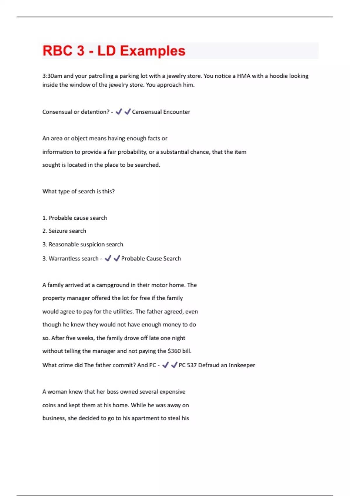 3:30am and your patrolling a parking lot with a jewelry store. You notice a HMA with a hoodie looking inside the window of the jewelry store. You approach him. Consensual or detention? - Censensual Encounter An area or object means having enough facts or information to provide a fair probability, or a substantial chance, that the item sought is located in the place to be searched. What type of search is this? 1. Probable cause search 2. Seizure search 3. Reasonable suspicion search 3. Warrantless search - Probable Cause Search A family arrived at a campground in their motor home. The property manager offered the lot for free if the family would agree to pay for the utilities. The father agreed, even though he knew they would not have enough money to do so. After five weeks, the family drove off late one night without telling the manager and not paying the $360 bill. What crime did The father commit? And PC - PC 537 Defraud an Innkeeper A woman knew that her boss owned several expensive coins and kept them at his home. While he was away on business, she decided to go to his apartment to steal hiscoin collection. She entered the apartment with the key he kept in his desk at the office. She went to the drawer where the coins were stored; however, they weren't there. She quickly left the apartment. She committed what crime? - Burglary Officers with a warrant set off firecrackers to simulate gunfire, then asked the occupants inside the fortress-like house to come outside to check their vehicles for damage. Once the barricades to the home were down, the officers announced their identity and authority to conduct a search. This is called a what type of entry? Legal Entry Search Entry Consent Entry Ruse Entry Warrantless entry - Ruse Entry During a search authorized by a search warrant, officers are limited by the information specified in the search warrant. This is known what type of search? Scope of the search Warrantless search Indoor searchExecution search - Scope of the search Two officers conducting a valid, warrantless administrative inspection of an automobile repair shop came across evidence of drugs in plain view and through plain smell. Do the officers have legal authority to seize the evidence? - Yes because they were conducting other legal business in that location In deciding whether a warrantless search or seizure was legal, courts will always consider ___________________. However, peace officers must always have specific facts to demonstrate the search or seizure fell within one of the exceptions to the warrant requirement. All the facts Totality of the circumstances Reasonable suspicion Probable cause - Totality of the circumstances An officer was in a hotel room questioning a female companion of a man who had been arrested for armed robbery earlier that day. In the course of the questioning, the woman grabbed her make-up bag from a nearby dresser. Because it was reasonable to suspect that the woman might be reaching for a weapon, the officer seized the bag. When the officer realized the bag was heavy and large enough to potentially contain a weapon, he opened the bag to search it. Is the officer able to search the bag even though he did not see an imprint of a weapon in a pat down/frisk search? - Yes While on routine patrol one morning, two officers spotted a young man looking into parked cars in an alley where there had been earlier complaints of vehicle tampering. As the officers drove by slowly, the man tried to hide behind a dumpster. When the officers approached him, the man became nervous, boisterous, and antagonistic. Can the officers conduct lawfully frisk/pat search him for weapons or potential weapons? - Yes A man picked up his girlfriend in a car he had stolen. He bragged to her how easy it was to steal the car. They tookturns driving the car around until it ran out of gas and then they abandoned it. Who is guilty of vehicle theft? - Both are charged with vehicle theft since they both drove the car with intent to temporarily deprive, even if the girlfriend did not take the car. At 3:30 a.m., a woman was seen at the rear door of a closed building in an area where a number of recent burglaries had taken place. The officers stopped their vehicle and asked her if she needed any help. She acted nervous and shifted her weight from foot to foot. In doing so, a set of lock picks fell from her pocket. She could not credibly answer why she had the picks. Can the officers arrest her? What PC if they can arrest? - The officers could arrest her for PC 466 possession of burglary tools An employer asked his employee to have a copy of the master key made for the new vice president. The employee changed the number of keys on the request form and kept the extra key, planning to enter his employer's office after hours and steal office equipment. The employer noticed that an additional key was billed on the receipt and confronted the employee, who admitted the deceit. What can he be charged with? - The employee committed the crime of possession of burglary tools by having a key made with intent to commit a theft A man stole $2000 in jewelry. He gave an engagement ring and a diamond necklace to his girlfriend and admitted that he had stolen them. When he was arrested, she hid the jewelry and claimed she never received them. The police obtained a search warrant and found the jewelry hidden inher apartment. WhT crime has she committed? - She committed the crime of receiving stolen property because she concealed property known to be stolen. One night a woman entered her ex-boyfriend's home through an open window and waited for him to come home. When he arrived, the woman began professing her undying love for him. When she refused to leave, he called law enforcement. PC 602 Or PC 602.5 - PC 602.5 - She committed the crime of unauthorized entry of property as she did not have consent to enter his Home. A homeless man found a vacant apartment with a broken out window. He climbed through the win