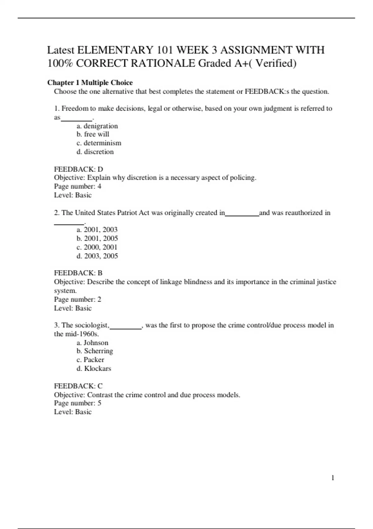 Latest ELEMENTARY 101 WEEK 3 ASSIGNMENT WITH 100% CORRECT RATIONALE Graded A+( Verified)