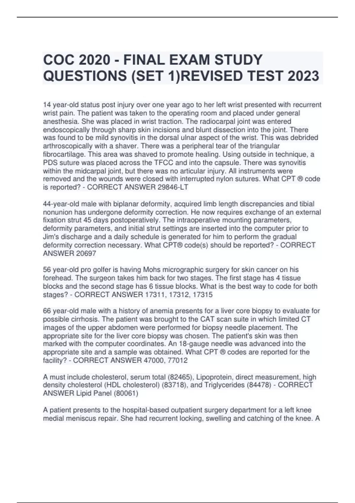 COC 2020 - FINAL EXAM STUDY QUESTIONS (SET 1)REVISED TEST 2023 14 year-old status post injury over one year ago to her left wrist presented with recurrent wrist pain. The patient was taken to the operating room and placed under general anesthesia. She was placed in wrist traction. The radiocarpal joint was entered endoscopically through sharp skin incisions and blunt dissection into the joint. There was found to be mild synovitis in the dorsal ulnar aspect of the wrist. This was debrided arthroscopically with a shaver. There was a peripheral tear of the triangular fibrocartilage. This area was shaved to promote healing. Using outside in technique, a PDS suture was placed across the TFCC and into the capsule. There was synovitis within the midcarpal joint, but there was no articular injury. All instruments were removed and the wounds were closed with interrupted nylon sutures. What CPT ® code is reported? - CORRECT ANSWER 29846-LT 44-year-old male with biplanar deformity, acquired limb length discrepancies and tibial nonunion has undergone deformity correction. He now requires exchange of an external fixation strut 45 days postoperatively. The intraoperative mounting parameters, deformity parameters, and initial strut settings are inserted into the computer prior to Jim's discharge and a daily schedule is generated for him to perform the gradual deformity correction necessary. What CPT® code(s) should be reported? - CORRECT ANSWER 20697 56 year-old pro golfer is having Mohs micrographic surgery for skin cancer on his forehead. The surgeon takes him back for two stages. The first stage has 4 tissue blocks and the second stage has 6 tissue blocks. What is the best way to code for both stages? - CORRECT ANSWER 17311, 17312, 17315 66 year-old male with a history of anemia presents for a liver core biopsy to evaluate for possible cirrhosis. The patient was brought to the CAT scan suite in which limited CT images of the upper abdomen were performed for biopsy needle placement. The appropriate site for the liver core biopsy was chosen. The patient's skin was then marked with the computer coordinates. An 18-gauge needle was advanced into the appropriate site and a sample was obtained. What CPT ® codes are reported for the facility? - CORRECT ANSWER 47000, 77012 A must include cholesterol, serum total (82465), Lipoprotein, direct measurement, high density cholesterol (HDL cholesterol) (83718), and Triglycerides (84478) - CORRECT ANSWER Lipid Panel (80061) A patient presents to the hospital-based outpatient surgery department for a left knee medial meniscus repair. She had recurrent locking, swelling and catching of the knee. A diagnostic arthroscopy was performed. Under direct visualization, a medial portal was established and debridement of the posterior horn of the medial meniscus was performed. A shaver was then introduced to trim the meniscus back to a stable rim. The remainder of the knee was probed. The scope was then withdrawn and the wound was closed with #4-0 Vicryl. The discharge diagnosis was a bucket-handle tear of the medial meniscus. The patient tolerated the procedure well. What are the correct procedure and diagnosis codes for this encounter? - CORRECT ANSWER 29881, S83.212A A 12 year-old child presents to the ED with an acute exacerbation of asthma. The patient is wheezing and is having difficulty breathing. She is not responding to the therapy. The physician documents as the final diagnosis asthma with status asthmaticus. What ICD-10-CM code(s) is/are reported? - CORRECT ANSWER J45.902 A 12 year-old's diabetes mellitus is well controlled with oral antidiabetic medications . The patient has no complications. Applying the coding concept from ICD-10-CM guidelines I.C.4.a.l, I.C.4.a.2, and I.C.4.a.3, what ICD-10-CM code(s) is/are reported? - CORRECT ANSWER E11.9, Z79.84 A 13 year-old is seen in the emergency department with a sudden onset of nausea, fever and diarrhea. A stool culture indicated Salmonella bacterium. The patient stated that she had been at a family reunion and recalls eating some salad, ice-cream and chicken. Diagnosis made was salmonella gastroenteritis. Report the diagnosis code(s) for the visit. - CORRECT ANSWER A02.0 A 14-year-old male is brought to the ER by his parents after hitting his left knee on the base when sliding into base at a baseball game in a public park. After X-rays were obtained, it revealed a sprain to the knee. The patient was instructed to keep his leg elevated and keep weight off of it as much as possible for the next two weeks. What diagnosis codes are reported for this encounter? - CORRECT ANSWER S83.92XA, W21.89XA, Y92.830, Y93.64 A 15 year old female undergoing treatment for Hodgkin's lymphoma presents to the behavioral health clinic to be evaluated for increasing acute panic attacks during her cancer treatments. The psychologist spent 1 hour and 15 minutes face-to-face with the patient. The patient was diagnosed with adjustment disorder with anxiety and a treatment plan was initiated. She will be seen for a reassessment in 30 days. What are the correct CPT ® and ICD-10-CM codes to report this service? - CORRECT ANSWER 96150 x 5, F43.22, C81.90 A 15 year-old has been taken to surgery for crushing his index and middle fingers, injuring his digital nerves of the left hand. The physician located the damaged nerves in both fingers and sutures them to restore sensory function. What CPT® and ICD-10-CM codes are reported? - CORRECT ANSWER 64831-LT, 64832-LT, S64.491A, S64.493A A 16 year-old male is brought to the ED by his mother. He was riding his bicycle in the park when he fell off the bike. The patient's right arm is painful to touch, discolored, and swollen. The X-ray shows a closed fracture of the ulna. What ICD-10-CM codes are reported? - CORRECT ANSWER S52.201A, V18.0XXA, Y92.830 A 19 year-old female is seen in the hospital-based outpatient department for surgical implantation of birth control. Once prepped and draped, the surgeon ma
