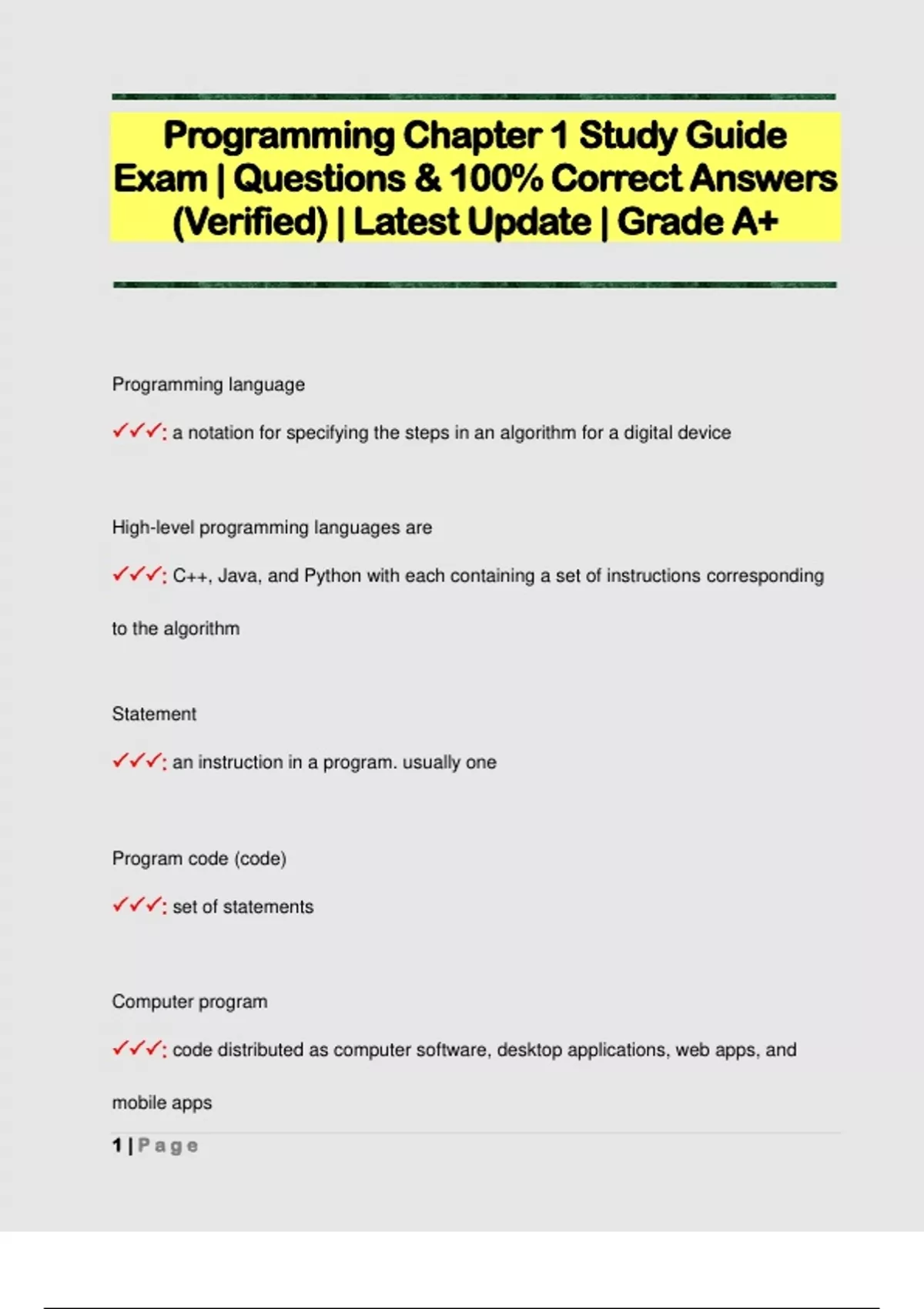Programming Chapter 1 Study Guide Exam | Questions & 100% Correct Answers (Verified) | Latest Update | Grade A+