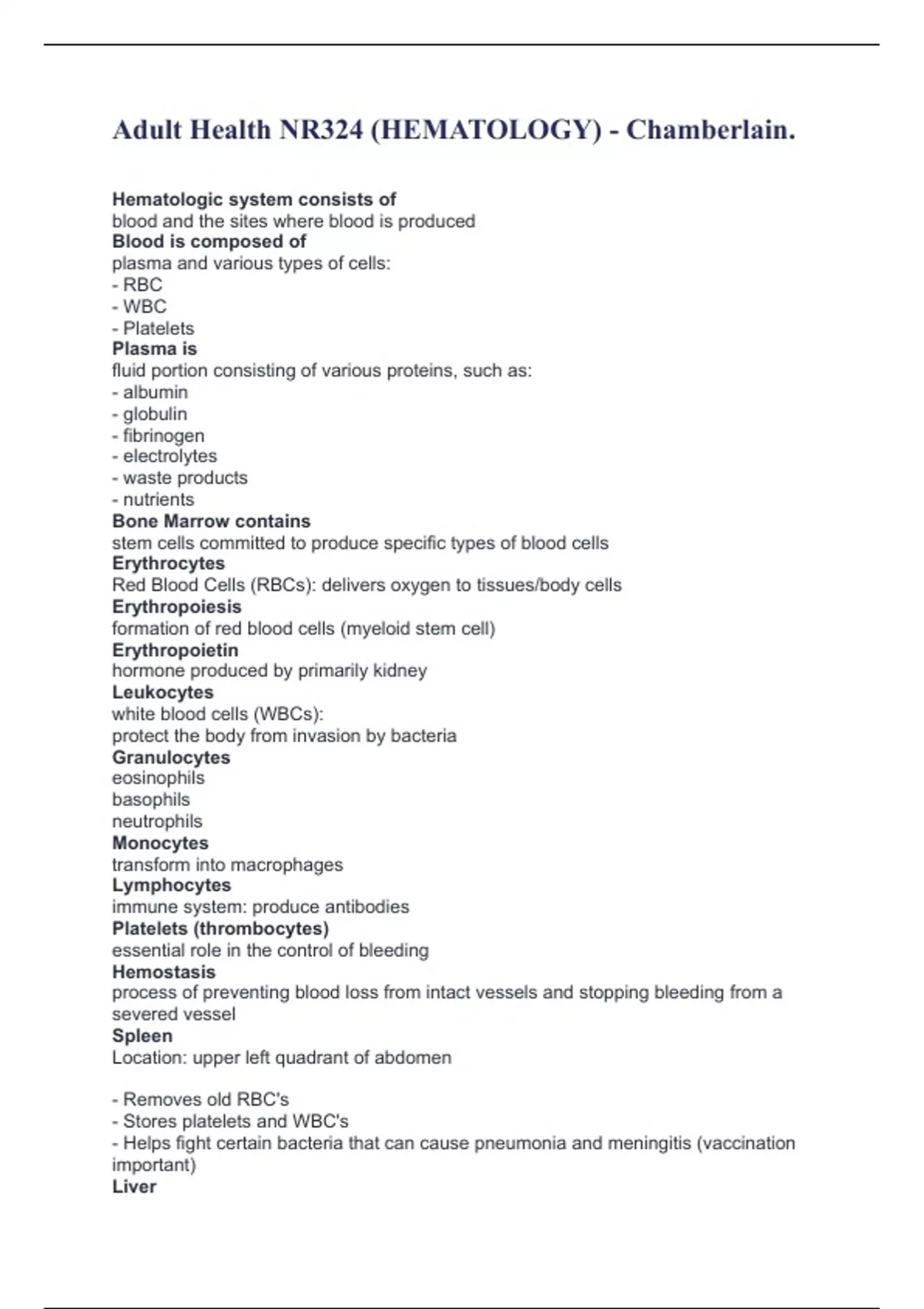 Adult Health NR324 (HEMATOLOGY) - Chamberlain. Hematologic system consists of blood and the sites where blood is produced Blood is composed of plasma and various types of cells: - RBC - WBC - Platelets Plasma is fluid portion consisting of various proteins, such as: - albumin - globulin - fibrinogen - electrolytes - waste products - nutrients Bone Marrow contains stem cells committed to produce specific types of blood cells Erythrocytes Red Blood Cells (RBCs): delivers oxygen to tissues/body cells Erythropoiesis formation of red blood cells (myeloid stem cell) Erythropoietin hormone produced by primarily kidney Leukocytes white blood cells (WBCs): protect the body from invasion by bacteria Granulocytes eosinophils basophils neutrophils Monocytes transform into macrophages Lymphocytes immune system: produce antibodies Platelets (thrombocytes) essential role in the control of bleeding Hemostasis process of preventing blood loss from intact vessels and stopping bleeding from a severed vessel Spleen Location: upper left quadrant of abdomen - Removes old RBC's - Stores platelets and WBC's - Helps fight certain bacteria that can cause pneumonia and meningitis (vaccination important) Liver