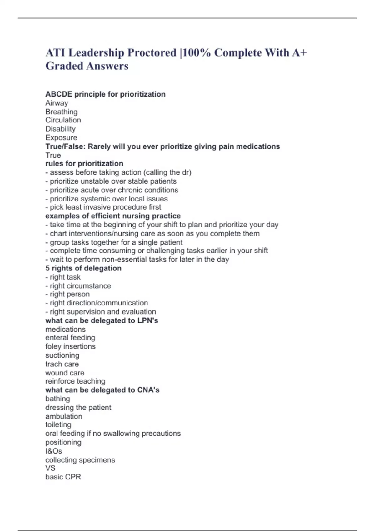 ATI Leadership Proctored |100% Complete With A+ Graded Answers ABCDE principle for prioritization Airway Breathing Circulation Disability Exposure True/False: Rarely will you ever prioritize giving pain medications True rules for prioritization - assess before taking action (calling the dr) - prioritize unstable over stable patients - prioritize acute over chronic conditions - prioritize systemic over local issues - pick least invasive procedure first examples of efficient nursing practice - take time at the beginning of your shift to plan and prioritize your day - chart interventions/nursing care as soon as you complete them - group tasks together for a single patient - complete time consuming or challenging tasks earlier in your shift - wait to perform non-essential tasks for later in the day 5 rights of delegation - right task - right circumstance - right person - right direction/communication - right supervision and evaluation what can be delegated to LPN's medications enteral feeding foley insertions suctioning trach care wound care reinforce teaching what can be delegated to CNA's bathing dressing the patient ambulation toileting oral feeding if no swallowing precautions positioning I&Os collecting specimens VS basic CPR