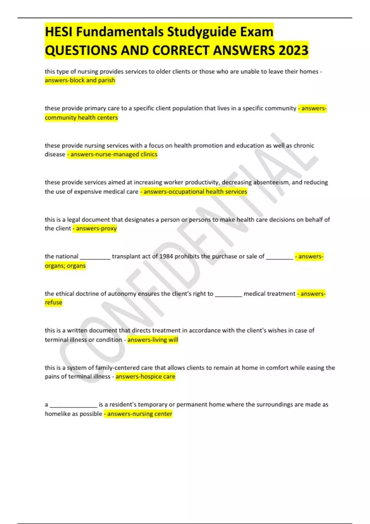 HESI Fundamentals Studyguide Exam QUESTIONS AND CORRECT ANSWERS 2023 this type of nursing provides services to older clients or those who are unable to leave their homes - answers-block and parish these provide primary care to a specific client population that lives in a specific community - answerscommunity health centers