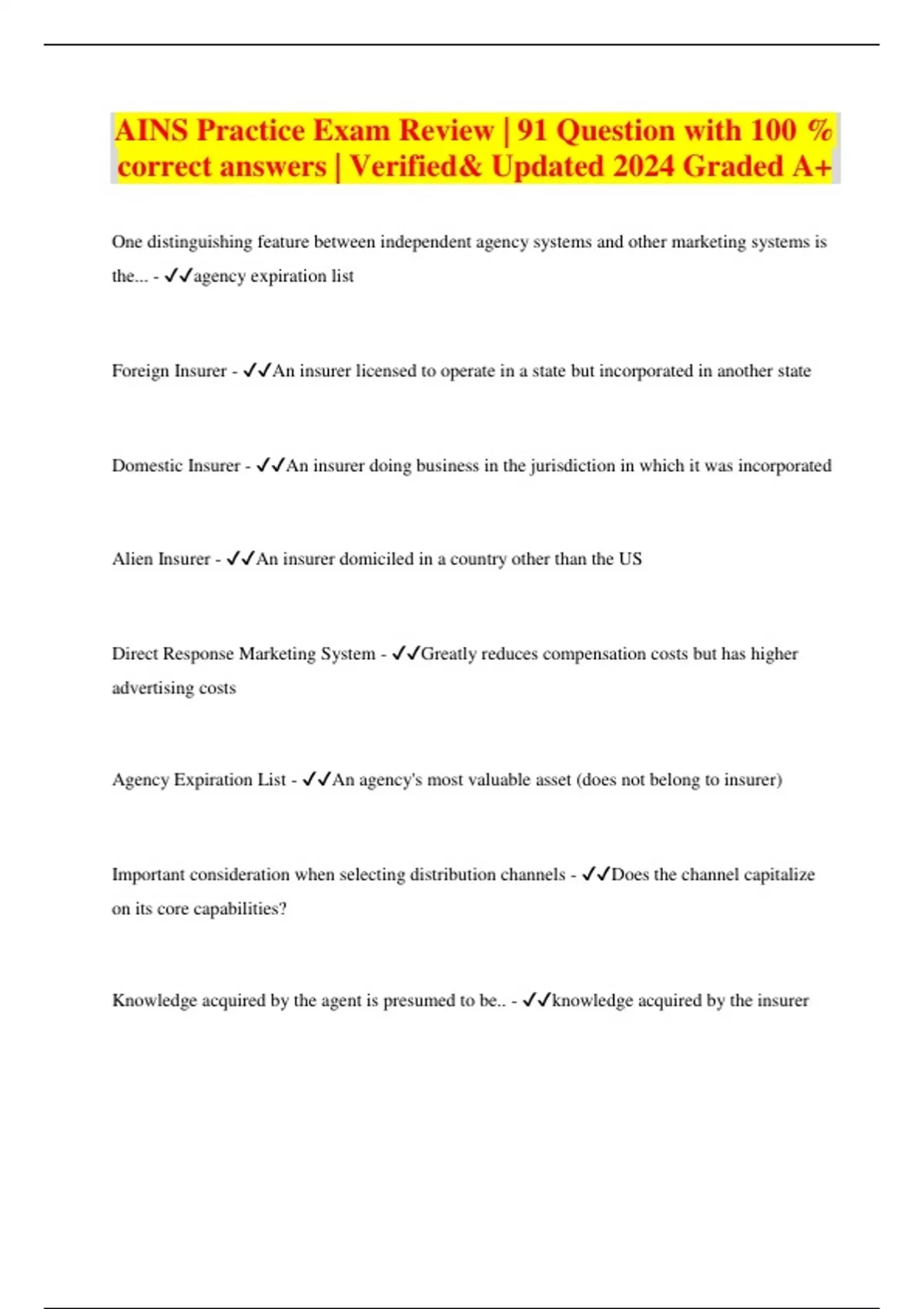 AINS Practice Exam Review | 91 Question with 100 % correct answers | Verified& Updated 2024 Graded A+ One distinguishing feature between independent agency systems and other marketing systems is the... - agency expiration list Foreign Insurer - An insurer licensed to operate in a state but incorporated in another state Domestic Insurer - An insurer doing business in the jurisdiction in which it was incorporated Alien Insurer - An insurer domiciled in a country other than the US Direct Response Marketing System - Greatly reduces compensation costs but has higher advertising costs Agency Expiration List - An agency's most valuable asset (does not belong to insurer) Important consideration when selecting distribution channels - Does the channel capitalize on its core capabilities? Knowledge acquired by the agent is presumed to be.. - knowledge acquired by the insurer Premium collection method used for personal insurance and small commercial accounts - Direct Bill What specifies scope of authority of an agent? - Agency contract Agency Bill - Payment procedure in which a producer sends premium bills to the insured, collects the premium, and sends the premium to the insurer, less any commission Item Basis - Premium (less commission) is forwarded to the insurer when the producer collects it or when it comes due. Least complex method Statement Basis - Insurer sends statement to the producer showing the premiums due. Producer is obligated to pay the premiums as due. Account Current Basis - Producer periodically prepares a statement showing the premiums due to the insurer, after deducting appropriate commissions, and transmits the amount to the insurer. The agency contract will indicate how often the producer must submit the account current statement (usually monthly). Producer must pay when premium is due, even if policyholder hasn't paid. Purposes of underwriting - Develop and maintain a book of business, guard against adverse selection, ensure adequate policyholder's surplus and enforce underwriting guidelines