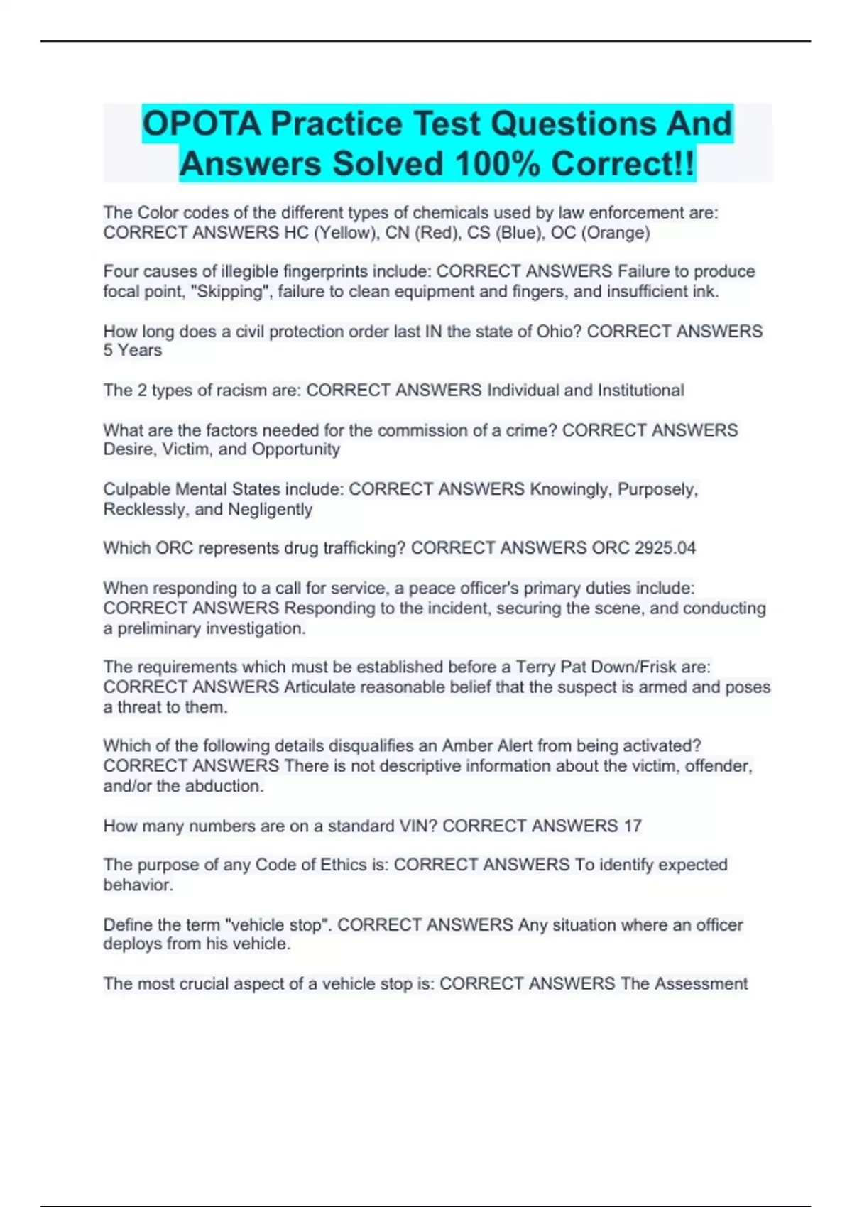 OPOTA Practice Test Questions And Answers Solved 100% Correct!!