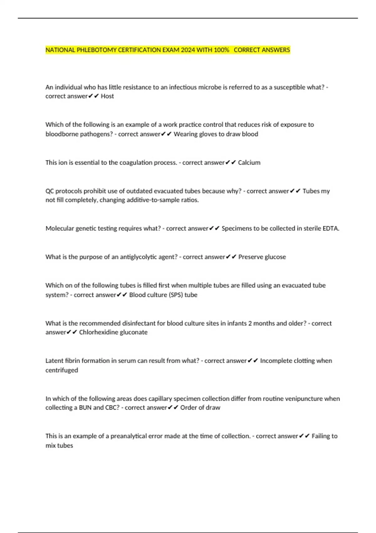 NATIONAL PHLEBOTOMY CERTIFICATION EXAM 2024 WITH 100% CORRECT ANSWERS An individual who has little resistance to an infectious microbe is referred to as a susceptible what? - correct answer Host Which of the following is an example of a work practice control that reduces risk of exposure to bloodborne pathogens? - correct answer Wearing gloves to draw blood This ion is essential to the coagulation process. - correct answer Calcium QC protocols prohibit use of outdated evacuated tubes because why? - correct answer Tubes my not fill completely, changing additive-to-sample ratios. Molecular genetic testing requires what? - correct answer Specimens to be collected in sterile EDTA. What is the purpose of an antiglycolytic agent? - correct answer Preserve glucose Which on of the following tubes is filled first when multiple tubes are filled using an evacuated tube system? - correct answer Blood culture (SPS) tube What is the recommended disinfectant for blood culture sites in infants 2 months and older? - correct answer Chlorhexidine gluconate Latent fibrin formation in serum can result from what? - correct answer Incomplete clotting when centrifuged In which of the following areas does capillary specimen collection differ from routine venipuncture when collecting a BUN and CBC? - correct answer Order of draw