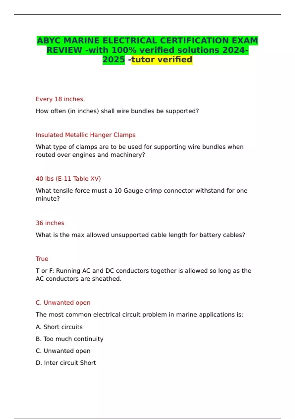 ABYC MARINE ELECTRICAL CERTIFICATION EXAM REVIEW -with 100% verified solutions -tutor verified