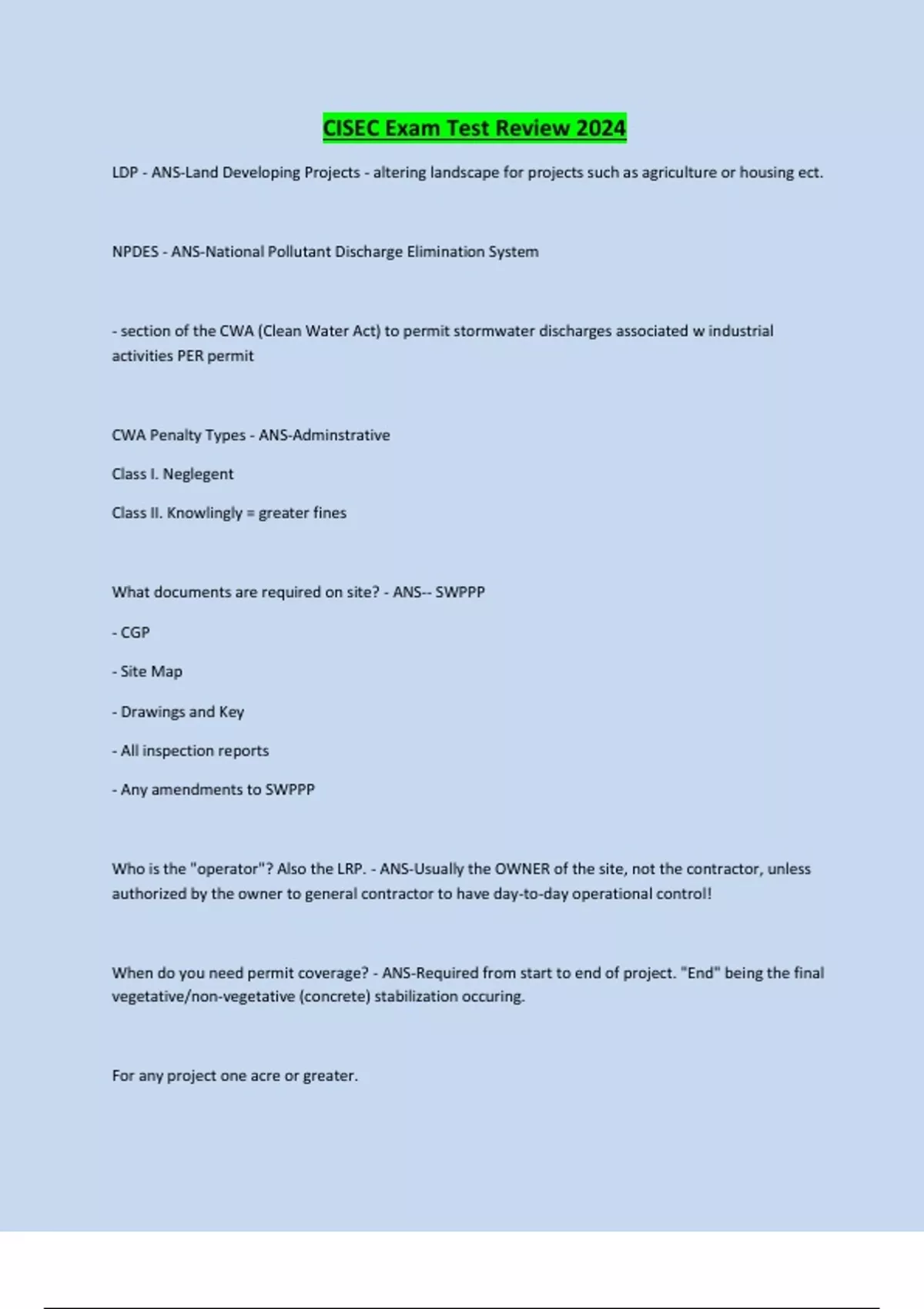 CISEC Exam Test Review 2024 LDP - ANS-Land Developing Projects - altering landscape for projects such as agriculture or housing ect. NPDES - ANS-National Pollutant Discharge Elimination System - section of the CWA (Clean Water Act) to permit stormwater discharges associated w industrial activities PER permit CWA Penalty Types - ANS-Adminstrative Class I. Neglegent Class II. Knowlingly = greater fines What documents are required on site? - ANS-- SWPPP - CGP - Site Map - Drawings and Key - All inspection reports - Any amendments to SWPPP Who is the "operator"? Also the LRP. - ANS-Usually the OWNER of the site, not the contractor, unless authorized by the owner to general contractor to have day-to-day operational control! When do you need permit coverage? - ANS-Required from start to end of project. "End" being the final vegetative/non-vegetative (concrete) stabilization occuring. For any project one acre or greater. Large Land Development - ANS--strips off all existing vegetation a.k.a site carving -usually on hillsides and steep slopes -installation of untilities that tear up large areas of land Vertical Projects - ANS-- Homebuilding, smaller residence construction projects -usually multiple subcontractors -requires lots of housekeeping = mass choas Bix Box Projects - ANS--commercial buildings -mass grading and mass choas -highly visible w/ fairly large footprint Linear Projects - ANS... Continues...