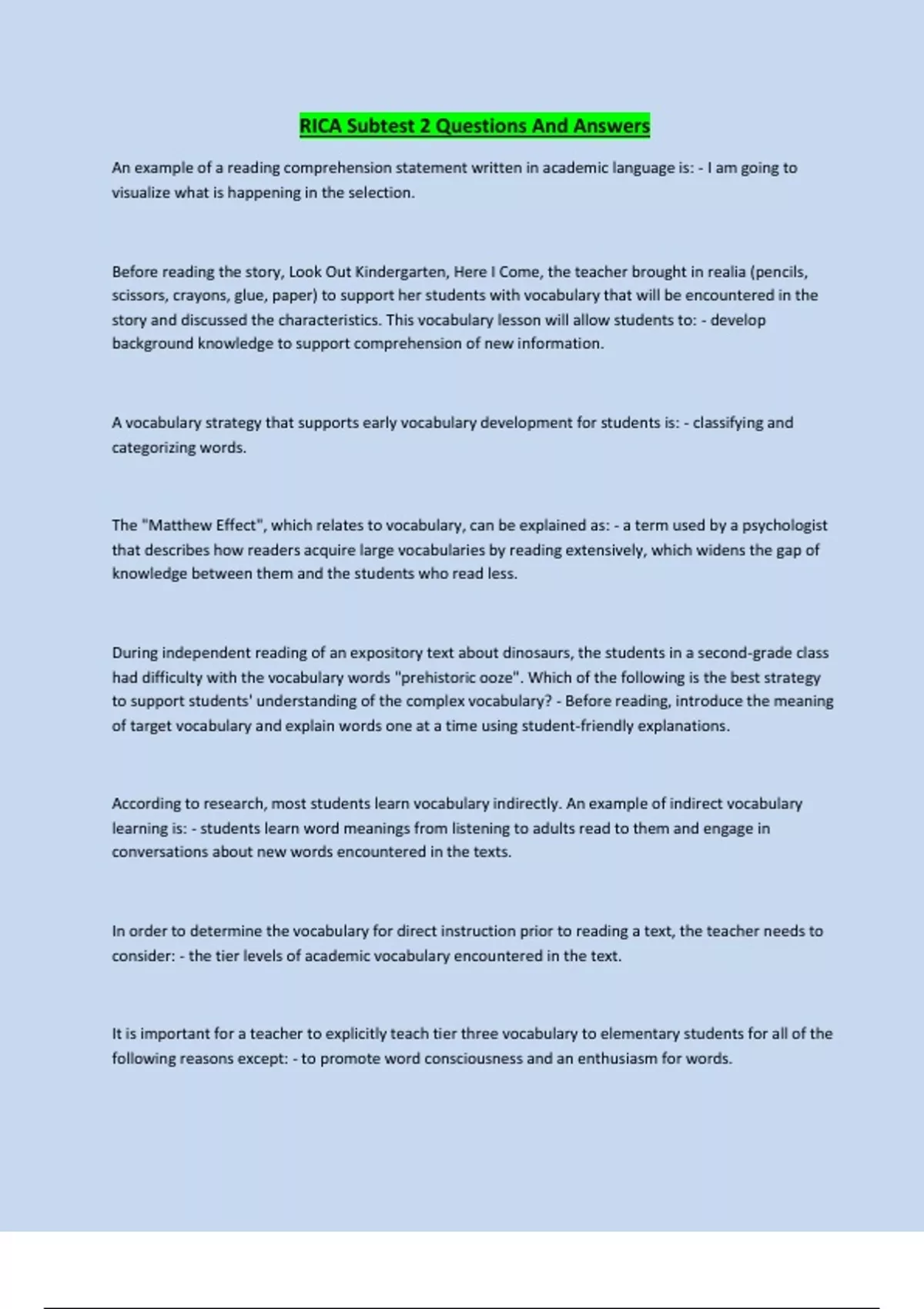 RICA Subtest 2 Questions And Answers An example of a reading comprehension statement written in academic language is: - I am going to visualize what is happening in the selection. Before reading the story, Look Out Kindergarten, Here I Come, the teacher brought in realia (pencils, scissors, crayons, glue, paper) to support her students with vocabulary that will be encountered in the story and discussed the characteristics. This vocabulary lesson will allow students to: - develop background knowledge to support comprehension of new information. A vocabulary strategy that supports early vocabulary development for students is: - classifying and categorizing words. The "Matthew Effect", which relates to vocabulary, can be explained as: - a term used by a psychologist that describes how readers acquire large vocabularies by reading extensively, which widens the gap of knowledge between them and the students who read less. During independent reading of an expository text about dinosaurs, the students in a second-grade class had difficulty with the vocabulary words "prehistoric ooze". Which of the following is the best strategy to support students' understanding of the complex vocabulary? - Before reading, introduce the meaning of target vocabulary and explain words one at a time using student-friendly explanations. According to research, most students learn vocabulary indirectly. An example of indirect vocabulary learning is: - students learn word meanings from listening to adults read to them and engage in conversations about new words encountered in the texts. In order to determine the vocabulary for direct instruction prior to reading a text, the teacher needs to consider: - the tier levels of academic vocabulary encountered in the text. It is important for a teacher to explicitly teach tier three vocabulary to elementary students for all of the following reasons except: - to promote word consciousness and an enthusiasm for words. Prior to teaching a lesson on mammals, a third-grade teacher displayed the following graphic organizer on the board: This graphic organizer will support the student in developing: - word learning strategies. A fifth-grade teacher designs the following vocabulary lesson for her students:...