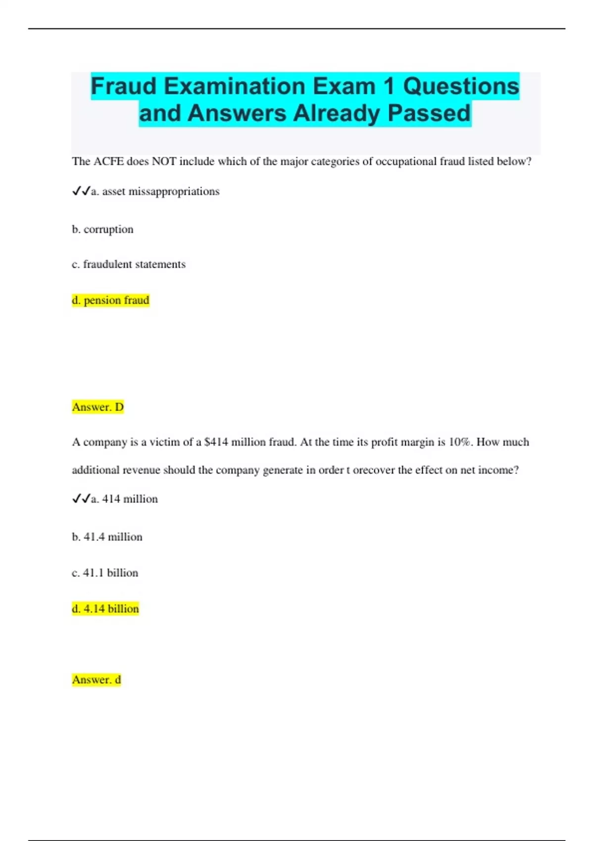 Fraud Examination Exam 1 Questions and Answers Already Passed The ACFE does NOT include which of the major categories of occupational fraud listed below? a. asset missappropriations b. corruption c. fraudulent statements d. pension fraud Answer. D A company is a victim of a $414 million fraud. At the time its profit margin is 10%. How much additional revenue should the company generate in order t orecover the effect on net income? a. 414 million b. 41.4 million c. 41.1 billion d. 4.14 billion Answer. d Fraud in companies such as WorldCom, Enron, Waste management, etc. are examples of : a. vendor fraud b. customer fraud c. management fraud d. investment scams answer. D A compnay was the victim of several frauds that totaled approximately 10 million in one year. Wit ha prfoit margin of 10 percent, and assuming that the company's product sold for 1,000 per unit, how many additional units must the company sell to compensate for the fraud losses? c. 100,000 Reason: (10 million loss/ 0.1 = 100 million in revenues. 100 million/ 1,000 per unit= 100,000 units) Which legal code makes the bribing of public officials illegal? b. title 18, US Code Section 201 The study conducted by the Association of Certified Fraud Examiners in 2008 estimated that US organizations lose _____ percent of their annual revenues to fraud. 7% Which of the following observations concerning occupational fraud is NOT true? a. it usually involves two or more employees b. it is committed for the purpose of direct or indirect financial benefit to the employee c. it costs the employing organization assets, revenues, or reserves d. it is clandestine Answer. a The Anti-Kickback Act of 1986 intends to prevent: a. the giving or receiving of anything of value by a subcontractor to a prime contractor in contracts b. any scheme by a contractor to gain the business of a global entity c. bribery, by punishing perpetrators with up to 15 years in prison d. the custom of lobbyists to give gifts to influence laws regarding business transactions Answer. a Which of the following in NOT a characteristic of management fraud? a. top managemetn deception b. kickbacks or bribes c. manipulation of financial statements d. pressure to earn year-end bonuses Answer: b Which of the following frauds is usually the most expensive? a. financial statement fraud b. vendor fraud c. occupational fraud d. customer fraud Answer. a Which of the following is the most common type of occupation fraud? a. employee embezzlement b. mail fraud