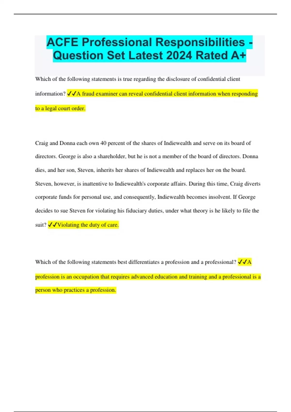 ACFE Professional Responsibilities - Question Set Latest 2024 Rated A+