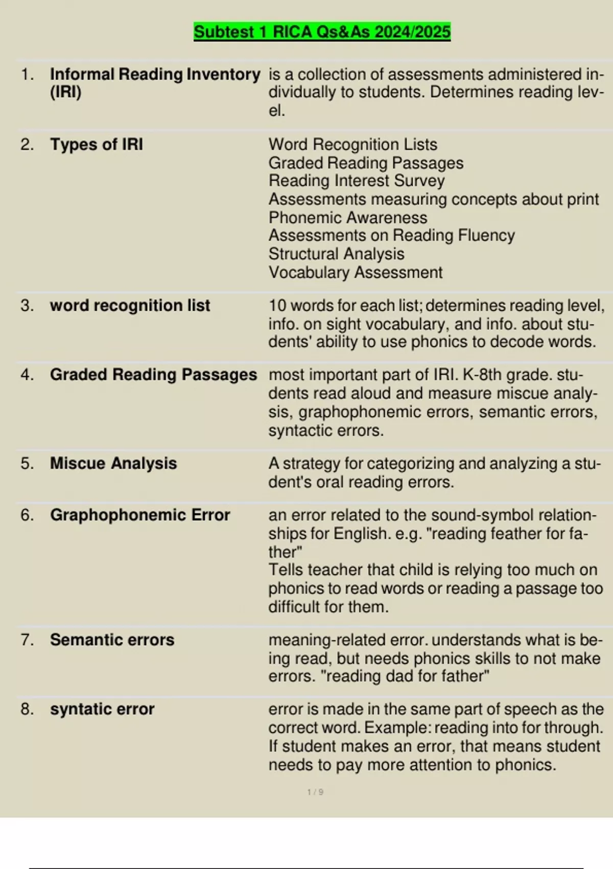 Subtest 1 RICA Qs&As 2024/2025 1 / 9 1. Informal Reading Inventory (IRI) is a collection of assessments administered individually to students. Determines reading level. 2. Types of IRI Word Recognition Lists Graded Reading Passages Reading Interest Survey Assessments measuring concepts about print Phonemic Awareness Assessments on Reading Fluency Structural Analysis Vocabulary Assessment 3. word recognition list 10 words for each list; determines reading level, info. on sight vocabulary, and info. about students' ability to use phonics to decode words. 4. Graded Reading Passages most important part of IRI. K-8th grade. students read aloud and measure miscue analysis, graphophonemic errors, semantic errors, syntactic errors. 5. Miscue Analysis A strategy for categorizing and analyzing a student's oral reading errors. 6. Graphophonemic Error an error related to the sound-symbol relationships for English. e.g. "reading feather for father" Tells teacher that child is relying too much on phonics to read words or reading a passage too difficult for them. 7. Semantic errors meaning-related error. understands what is being read, but needs phonics skills to not make errors. "reading dad for father" 8. syntatic error error is made in the same part of speech as the correct word.Example:reading into for through. If student makes an error, that means student needs to pay more attention to phonics. Continues...