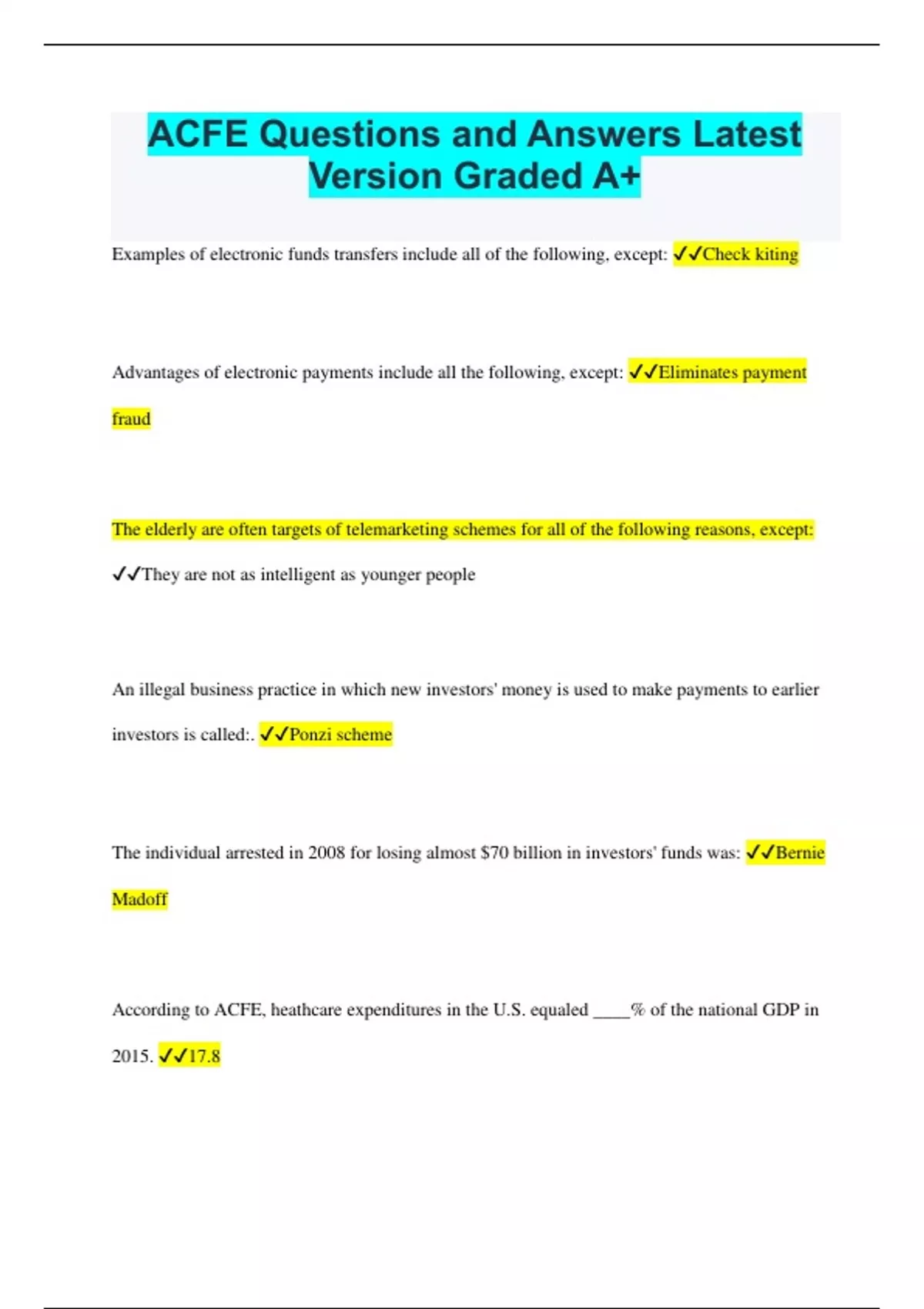 ACFE Questions and Answers Latest Version Graded A+ Examples of electronic funds transfers include all of the following, except: Check kiting Advantages of electronic payments include all the following, except: Eliminates payment fraud The elderly are often targets of telemarketing schemes for all of the following reasons, except: They are not as intelligent as younger people An illegal business practice in which new investors' money is used to make payments to earlier investors is called:. Ponzi scheme The individual arrested in 2008 for losing almost $70 billion in investors' funds was: Bernie Madoff According to ACFE, heathcare expenditures in the U.S. equaled ____% of the national GDP in 2015. 17.8 All of the following are negative results of health care fraud, except: The cost of prescription drugs has dropped dramatically A reimbursement method in which providers receive one lump sum for each patient that they treat, regardless of how many services the provider renders to each patient is known as: capitation When a victim is tricked into divulging sensitive information using emails, fake websites, etc., it is called: phishing Controls to prevent password cracking include all of the following, except: Enhance firewall protection Types of malicious software that affect the normal operation of the computer and generally cause harm to the user or to the organization include all of the following, except: Easter eggs This case involves a company based in the country of cyprus The target of a potential fraud examination seems to be a person named: Yiannis All of the following are red flags appear in this case, except: the company's audit committee does not appear to be actively engaged in monitoring internal audit reports The type of fraud most likely being committed in this case is: Money laundering Money laundering is best defined by which of the following? The disguising of the existence, nature, source, ownership,