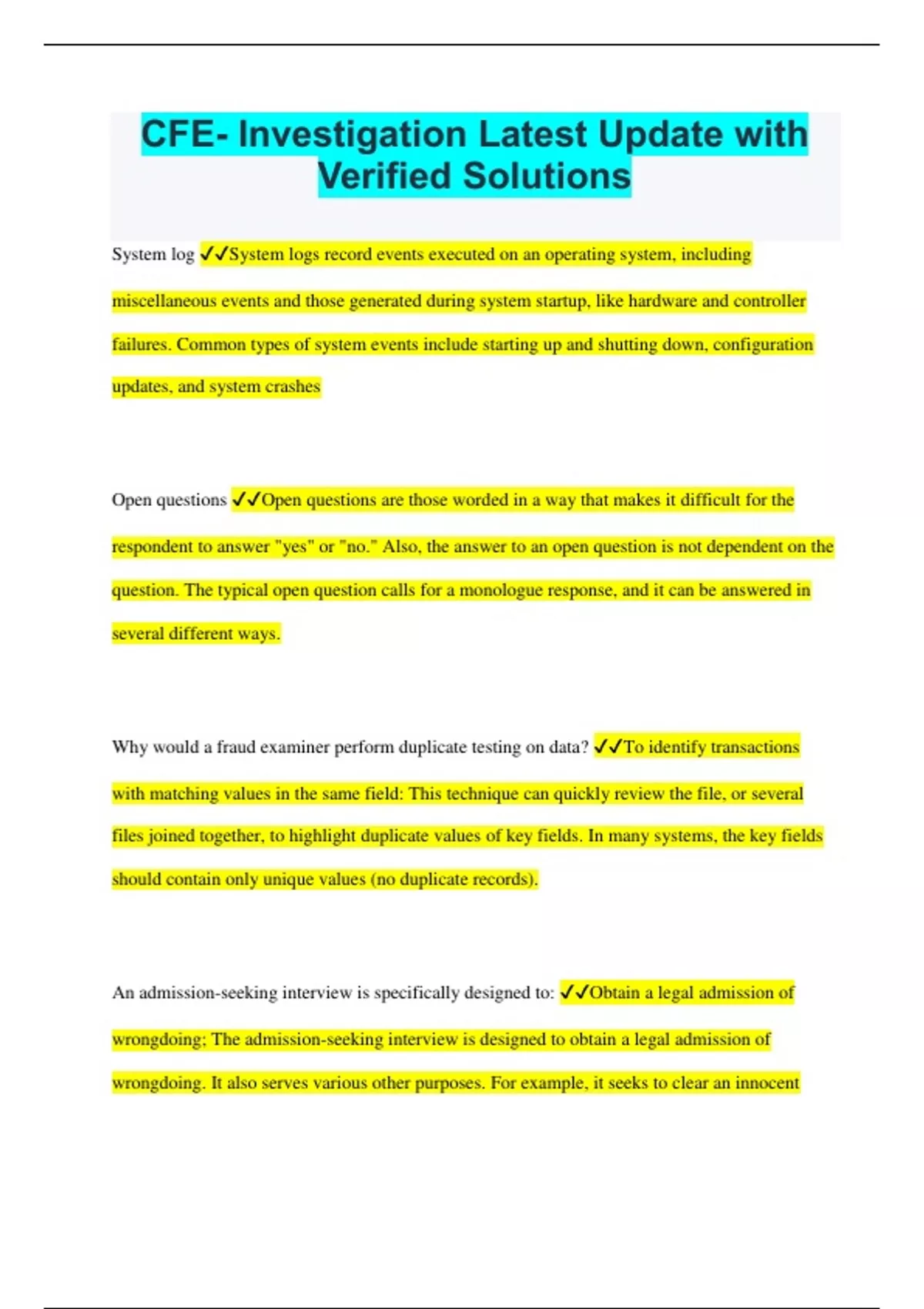 CFE- Investigation Latest Update with Verified Solutions System log System logs record events executed on an operating system, including miscellaneous events and those generated during system startup, like hardware and controller failures. Common types of system events include starting up and shutting down, configuration updates, and system crashes Open questions Open questions are those worded in a way that makes it difficult for the respondent to answer "yes" or "no." Also, the answer to an open question is not dependent on the question. The typical open question calls for a monologue response, and it can be answered in several different ways. Why would a fraud examiner perform duplicate testing on data? To identify transactions with matching values in the same field: This technique can quickly review the file, or several files joined together, to highlight duplicate values of key fields. In many systems, the key fields should contain only unique values (no duplicate records). An admission-seeking interview is specifically designed to: Obtain a legal admission of wrongdoing; The admission-seeking interview is designed to obtain a legal admission of wrongdoing. It also serves various other purposes. For example, it seeks to clear an innocent person and encourage a culpable person to confess. A culpable individual usually confesses during the admission-seeking phase of an interview, while an innocent person does not do so unless threats or coercion are used. Also, the interviewer will seek to obtain a valid confession. And finally, admission-seeking interviews are designed to convince the confessor to sign a written statement acknowledging the facts. Which of the following is LEAST likely to be revealed by analyzing a subject's electronic payment records? If the subject is skimming employer funds Electronic payments (or e-payments) refer to any type of noncash payment that does not involve a paper check. Electronic payment records can reveal, among other things: Assets the subject has purchased The locations of the subject's assets (e.g., through the payment of real estate taxes, broker's fees, or utility payments) The locations of the subject's residences and businesses (e.g., through analyzing the payments of utility bills) Loans the subject has obtained (e.g., through analyzing loan payments) Payments made to nonexistent employees with direct deposit The cities and countries in which the subject conducts business (e.g., through analyzing the payments for carrier services to deliver packages) Assets ostensibly owned by family members or close associates but effectively controlled, held, or gifted by the subject Hotel payments The true owner of a property (e.g., through analyzing the mortgage payments and payments for home owner insurance) Textual analytics is a method of using software to extract usable information from unstructured data. Which of the following is the most appropriate example of an alternative question? A. "Did you deliberately plan this, or did it just happen?" CORRECT B. "Did you, or did you not, commit this crime?" C. "How else might this situation be explained?" INCORRECT D. "Will you repay the money now or later?" A. "Did you deliberately plan this, or did it just happen?" The alternative question forces the accused to make one of two choices, both of which imply guilt. One alternative provides the accused with a morally acceptable reason for the misdeed; the other portrays the accused negatively. Regardless of which answer the accused chooses, he is acknowledging guilt. Which of the following is NOT a purpose of the follow-up/recommendations section of a written fraud examination report? To calculate the amount of loss caused by any misconduct identified during the investigation
