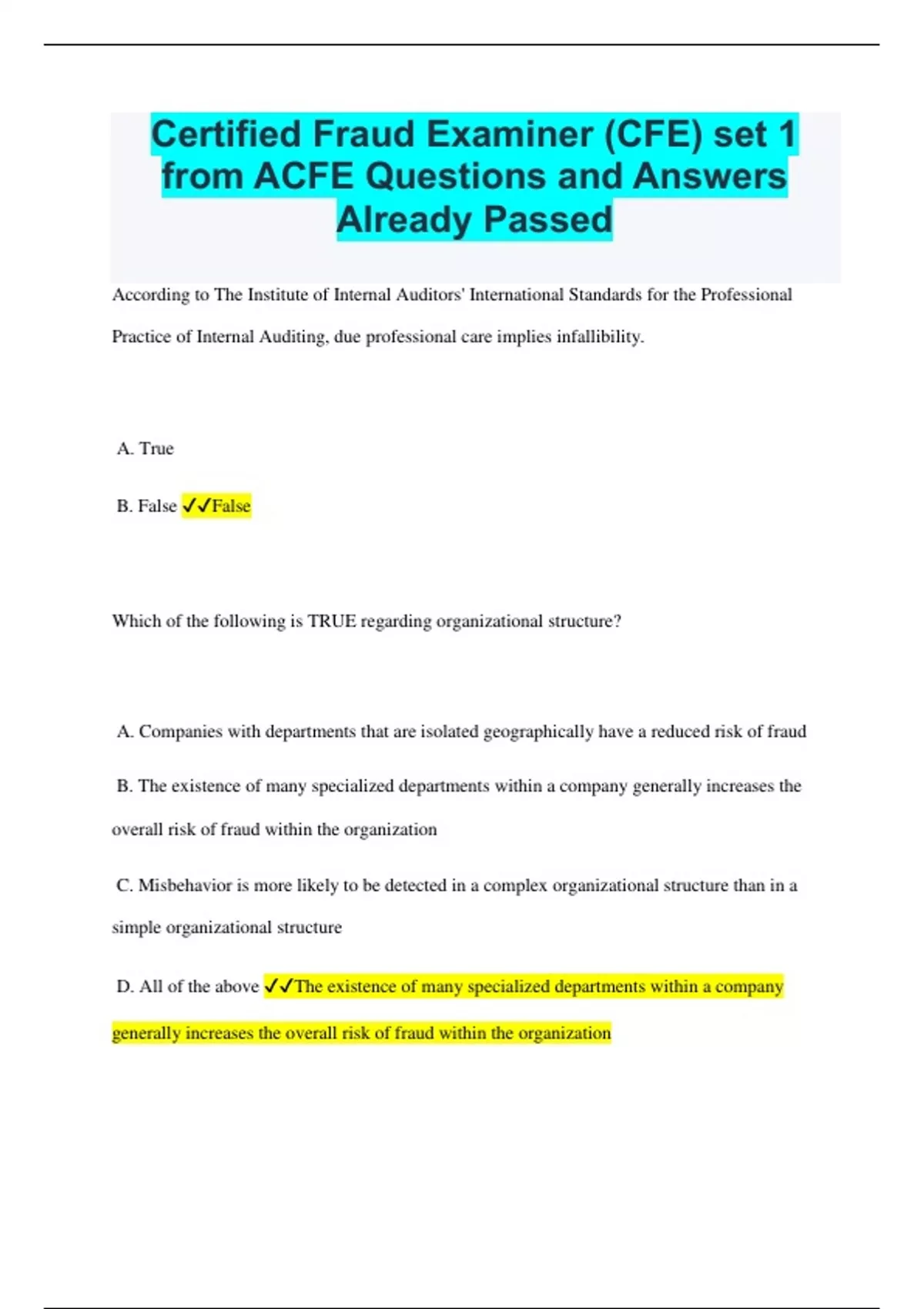Certified Fraud Examiner (CFE) set 1 from ACFE Questions and Answers Already Passed According to The Institute of Internal Auditors' International Standards for the Professional Practice of Internal Auditing, due professional care implies infallibility. A. True B. False False Which of the following is TRUE regarding organizational structure? A. Companies with departments that are isolated geographically have a reduced risk of fraud B. The existence of many specialized departments within a company generally increases the overall risk of fraud within the organization C. Misbehavior is more likely to be detected in a complex organizational structure than in a simple organizational structure D. All of the above The existence of many specialized departments within a company generally increases the overall risk of fraud within the organization Detective anti-fraud controls include all of the following EXCEPT: A. Hotline B. Proactive data analysis techniques C. Physical inspections D. Hiring policies and procedures Hiring policies and procedures According to AU Section 240, the auditor's assessment of the risk of material misstatement due to fraud at the financial statement level should have an effect on which of the following aspect(s) of an audit? A. Consideration of accounting principles used B. Assignment and supervision of personnel C. Choice of auditing procedures D. All of the above All the above The risk of the auditor not detecting a material misstatement resulting from employee fraud is greater than the risk of the auditor not detecting a material misstatement resulting from management fraud. A. True B. False False The risk of an auditor not detecting a material misstatement resulting from fraud is higher than the risk of an auditor not detecting a material misstatement resulting from the error. A. True B. False True Which of the following is/are included in the five fraud risk management principles described in the COSO/ACFE Fraud Risk Management Guide? A. Communicating the expectations of those governing the fraud risk management program B. Developing ongoing evaluations for each fraud risk management principle C. Performing comprehensive fraud risk assessments to identify specific fraud schemes D. All of the above All of the above Which of the following is TRUE regarding fraud risks? A. The objective of anti-fraud controls is to make the inherent