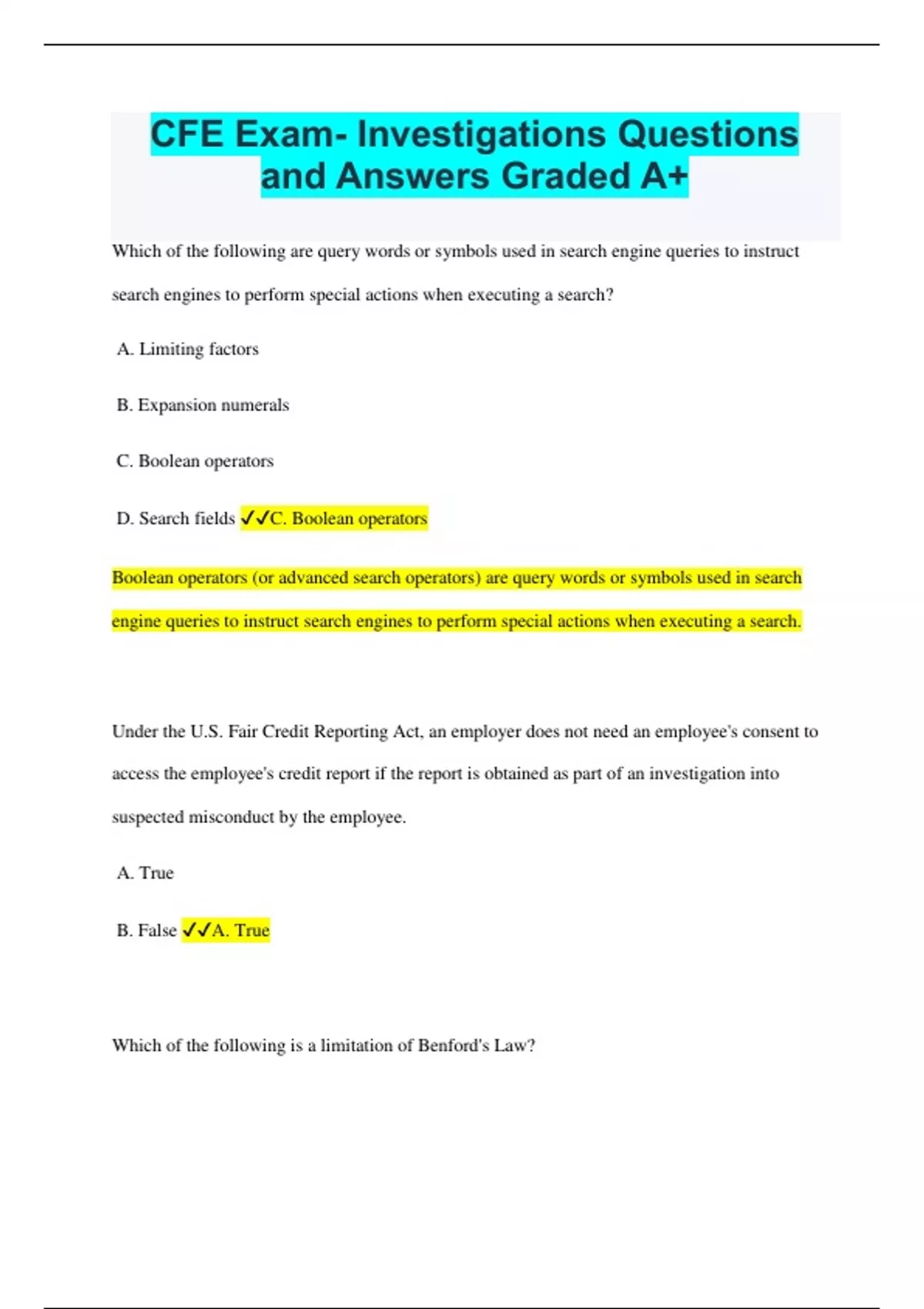 CFE Exam- Investigations Questions and Answers Graded A+ Which of the following are query words or symbols used in search engine queries to instruct search engines to perform special actions when executing a search? A. Limiting factors B. Expansion numerals C. Boolean operators D. Search fields C. Boolean operators Boolean operators (or advanced search operators) are query words or symbols used in search engine queries to instruct search engines to perform special actions when executing a search. Under the U.S. Fair Credit Reporting Act, an employer does not need an employee's consent to access the employee's credit report if the report is obtained as part of an investigation into suspected misconduct by the employee. A. True B. False A. True Which of the following is a limitation of Benford's Law? A. Benford's Law cannot be applied to data sets with non-natural numbers, such as check or invoice numbers. B. Benford's Law only works on data sets with assigned numbers, such as bank account or telephone numbers. C. Benford's Law applies best to data sets with three-digit numbers. D. Benford's Law can only be applied to data sets listed in currency amounts. A. Benford's Law cannot be applied to data sets with non-natural numbers, such as check or invoice numbers. Natural numbers are those numbers that are not ordered in a particular numbering scheme and are not human-generated or generated from a random number system. Non-natural numbers (e.g., employee identification numbers and telephone numbers) are designed systematically to convey information that restricts the natural nature of the number. Which of the following is a type of information that can be obtained from the deep Web? A. An old version of a Web page that has since been updated B. An archived version of a Web page that is no longer online C. Websites without any links pointing to them D. Web content indexed by standard search engines C. Websites without any links pointing to them A photo posted on a website that has been removed Content, views, writing, and opinions rescinded by an author A company's old job ads, statements, affiliations, or product lines Which of the following statements concerning the U.S. Health Insurance Portability and Accountability Act (HIPAA) is FALSE? A. In many situations, HIPAA restricts access to a patient's health information held by providers without the patient's written consent. B. If information about an employee's health or payment for medical services becomes an issue, fraud examiners should immediately contact human resources. C. Under HIPAA, protected health information can include information about past, present, or future health services. D. HIPAA defines protected health information as diagnoses and health conditions, but does not cover payment information. D. HIPAA defines protected health information as diagnoses and health conditions, but does not cover payment information. Which of the following is TRUE about using computer-created metadata in forensic investigations? A. Metadata information can help determine when a document was created B. Metadata information can help determine who received a document C. Metadata information can help determine who wrote a document D. All of the above D. All of the above Metadata information can help determine who wrote a document; who received, opened, copied, edited, moved, or printed the document; and when these events occurred. Which of the following is the most accurate statement about trying to locate a subject using online records? A. Online records are generally not useful in locating subjects whose address is unknown. B. If an individual has moved, obtaining a past address is usually of no help. C. Obtaining a past address of the subject should be the first step in trying to locate a subject using online records. D. Efforts to locate a subject using online records should begin with a search of the suspect's vehicle records. C. Obtaining a past address of the subject should be the first step in trying to locate a subject using online records.