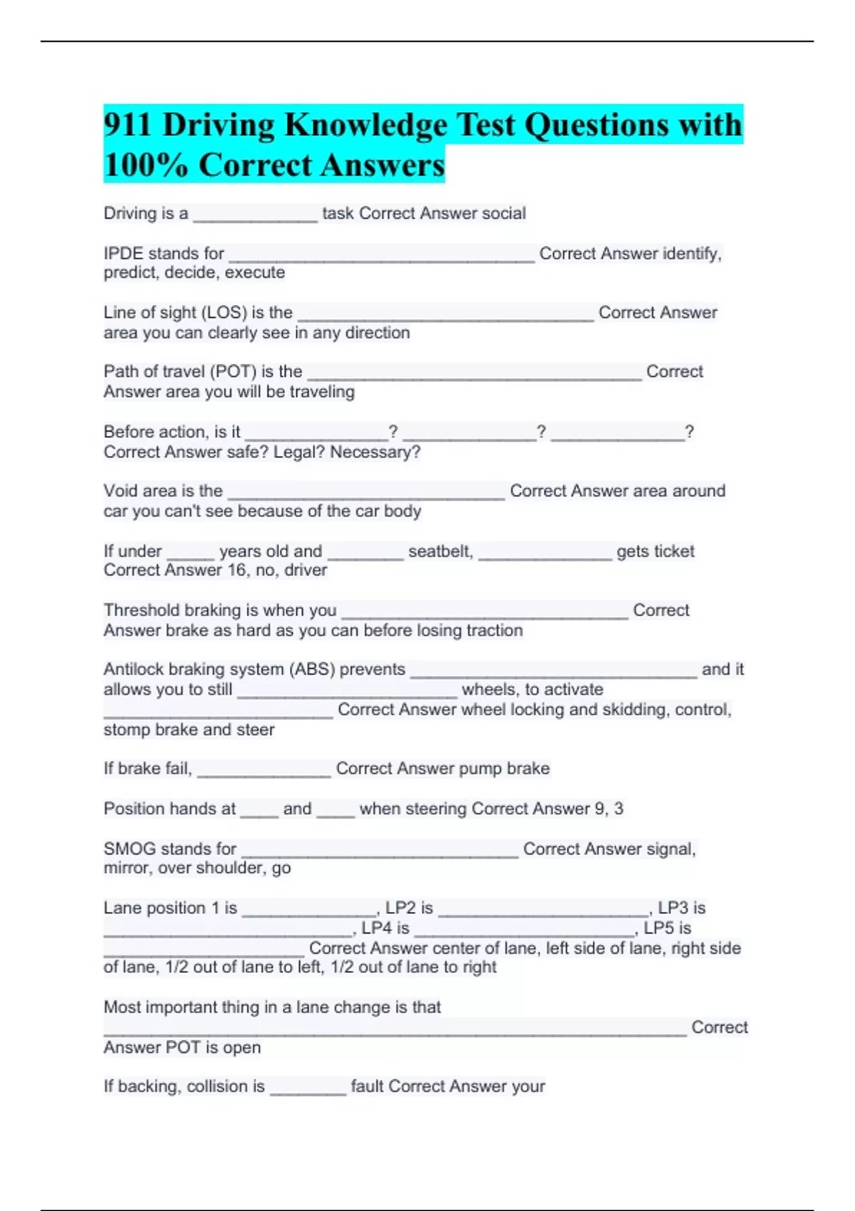 911 Driving Knowledge Test Questions with 100% Correct Answers