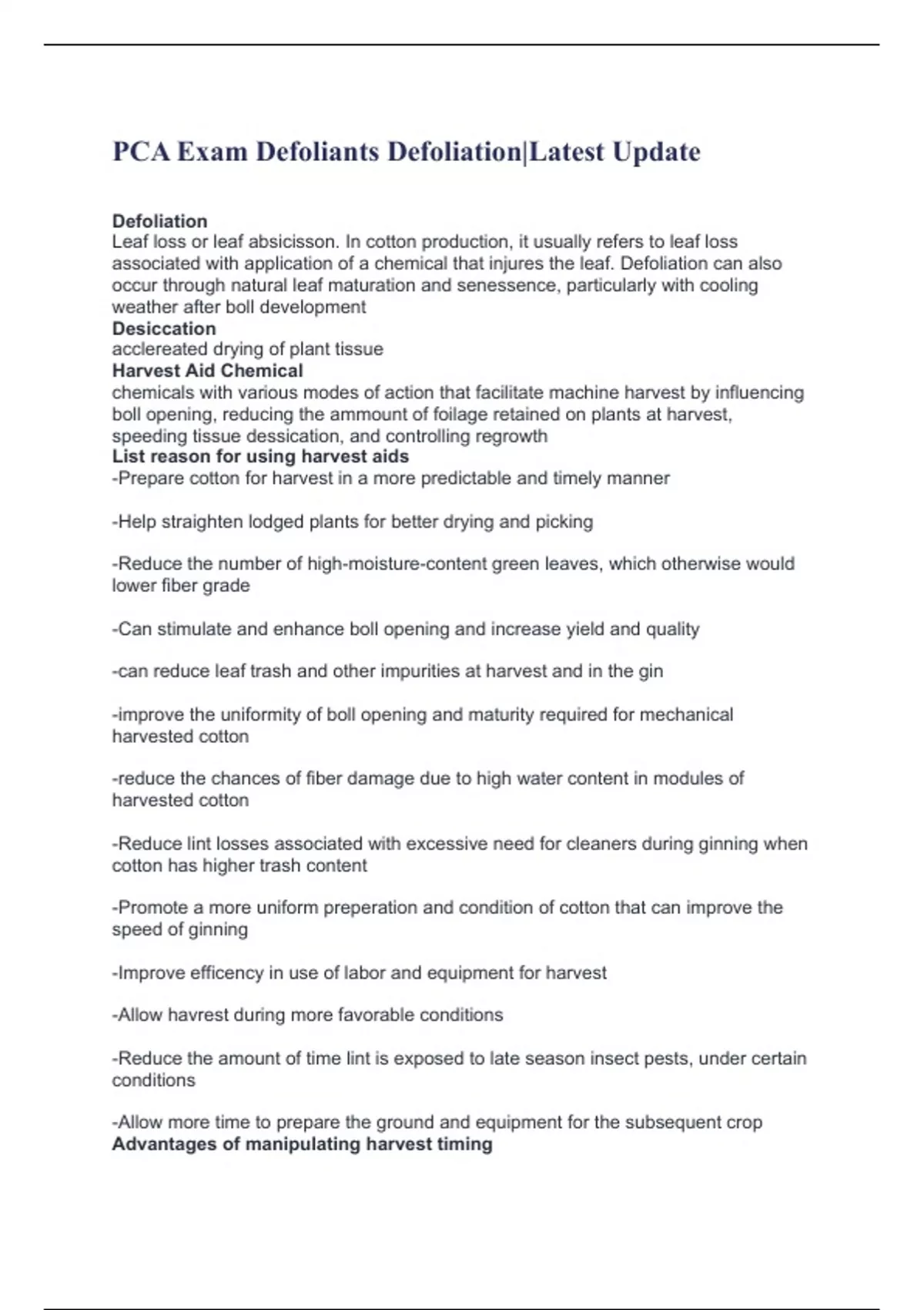 PCA Exam Defoliants Defoliation|Latest Update Defoliation Leaf loss or leaf absicisson. In cotton production, it usually refers to leaf loss associated with application of a chemical that injures the leaf. Defoliation can also occur through natural leaf maturation and senessence, particularly with cooling weather after boll development Desiccation acclereated drying of plant tissue Harvest Aid Chemical chemicals with various modes of action that facilitate machine harvest by influencing boll opening, reducing the ammount of foilage retained on plants at harvest, speeding tissue dessication, and controlling regrowth List reason for using harvest aids -Prepare cotton for harvest in a more predictable and timely manner -Help straighten lodged plants for better drying and picking -Reduce the number of high-moisture-content green leaves, which otherwise would lower fiber grade -Can stimulate and enhance boll opening and increase yield and quality -can reduce leaf trash and other impurities at harvest and in the gin -improve the uniformity of boll opening and maturity required for mechanical harvested cotton -reduce the chances of fiber damage due to high water content in modules of harvested cotton -Reduce lint losses associated with excessive need for cleaners during ginning when cotton has higher trash content -Promote a more uniform preperation and condition of cotton that can improve the speed of ginning -Improve efficency in use of labor and equipment for harvest -Allow havrest during more favorable conditions -Reduce the amount of time lint is exposed to late season insect pests, under certain conditions -Allow more time to prepare the ground and equipment for the subsequent crop Advantages of manipulating harvest timing -Works around growers schedule