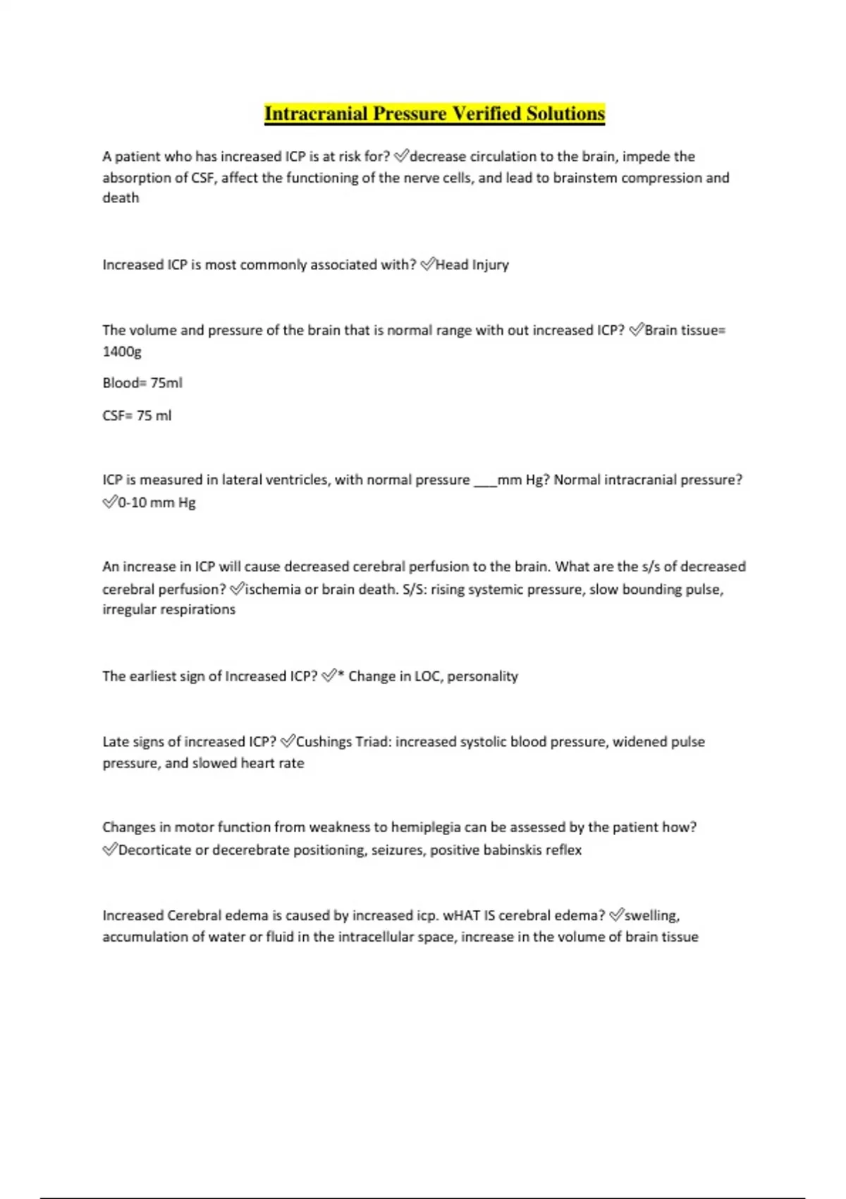 Increased Intracranial Pressure All Answers Correct What is Intracranial Pressure? ️The cranium has three comparements: 80% the brain, 10% blood and 10% CSF. Intracranial pressure is the pressure exerted within the cranium by these contents. Pressure usually ranges from 5-15mmHg. Monro-Kellie hypothesis ️The pressure-volume relationship between ICP, volume of CSF, blood, and brain tissue, and cerebral perfusion pressure (CPP) is known as the Monro-Kellie doctrine or the Monro Kellie hypothesis. If the volume of one component increases, the volume of the other component must decrease to keep the pressure within normal range. Increased ICP (The Cascade) ️When ICP increases, cerebral vasoconstriction occurs, which reduces cerebral blood and causes ischemia. If ischemia lasts longer than 5 minutes, the result is irreversible brain damage. ICP is also affected by CO2 and O2 in the blood, increased CO2 or decreased O2 cause vasodilation of the cerebral arteries. Increased ICP manifestations ️Changes in person's LOC, motor function, speech, vitals and becomes more dramatic as ICP increases. Location/cause will determine the symptoms. Later symptoms include decorticate (flexion) and decerebrate (extension) posturing indicate IICP in the patient and must be treated immediately. Cushing response occurs late in development of IICP. Cushing Triad ️Cushing's triad is a clinical triad variably defined as having: Irregular respirations (caused by impaired brainstem function) Bradycardia. Systolic hypertension (Widening Pulse Pressure) Two Major Complications with IICP ️Inadequate cerebral perfusion Cerebral herniation Early Signs of IICP: Compensatory mechanisms intact ️Altered LOC (confusion, restlessness,) Unilateral pupil change in size, equality, and or reactivity Alterted respiratory pattern (bradypnea or irregular pattern) Unilateral hemiparesis (one sided weakness) Variable signs include: focal findings (e.g speech, difficulty, visual disturbances), pailledema, vomiting, headache, seizures caused by irritation of the brain. Papilledmea ️Papilledema (or papilloedema) is optic disc swelling that is caused by increased intracranial pressure. The swelling is usually bilateral and can occur over a period of hours to weeks. Late signs of Increased ICP: Compensatory mechanisms failing ️Decreased LOC (stupor) Unilateral or bilateral puillary changes: size, equality, and or reactivity(global pressure) Ineffective breathing pattern (cheyne-stokes respiration) Abnormal motor response (decorticate or decerebrate posturing) Variable signs: HTN with widened pulse pressure. Bradycardia, hyperthermia Terminal signs of Increased ICP (Decompensation) ️Coma Bilaterally fixed and dilated pupils -no reaction to light Respiratory and cardiac arrest absence of motor response (flaccid) Dying Variable signs: HTN with widened pulse pressure. Bradycardia, hyperthermia ICP cascade pathophysiology map ️Insult to brain -> tissue edema -> Increased ICP -> compression of ventricles -> compression of blood vessels -> decreased cerebral blood flow -> decreased O2 with death of brain cells -> edema around necrotic tissue -> increased ICP with compression of brain stem and respiratory center -> accumulation of CO2 -> vasodilation -> increased ICP resulting from increased blood volume and death. Brain Herniation ️Brain herniation occurs late in the course of IICP. In an attempt to save the brain tissue, the brain shifts from an area of high pressure to low pressure. One common site of herniation is the foramen magnum (the hole at the base of the brain where the spinal cord exits. Nursing Diagnosis ️Ineffective airway clearance, ineffective tissue perfusion, impaired skin integrity, and self-care deficit Overall goals for Increased intracranial pressure ️ICP normalized, maintain patent airway, normal fluid and electrolyte balance, no complications secondary to immobility Nursing care IICP ️Normothermia PaO2 maintenance at 100mmHg or greater ABG analysis guides O2 therapy, may require mechanical ventilation Tylenol 1000mg every 4-6hr Cold cloth on body, cooling blanket, lower room temperature keep person quiet because it generates heat Drug IICP ️Mannitol -seperate IV potent diuretics pulls liters of fluid at a time, causes brain to shrink and calms pressure Loop diuretics Corticosteriods -decrease inflammation (Decadrom) Barbiturates -coma: take over bodily function and induce coma Antiseizure drugs -dilantin: phenytonin, prophylatic with NS -big loading dose, then daily dose to prevent seizures Antipyretics Nutritional Therapy ️Client is in hypermetabolic state and hypercatabolic state, need for glucose (Glucose IV will cause worsening Edema) neutral IV-Saline or lactated ringers. Keep client normo
