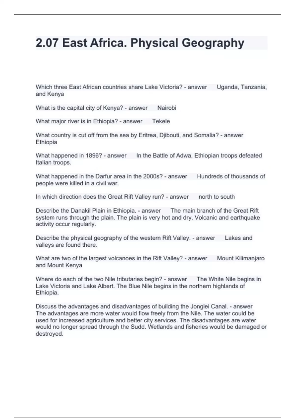 2.07 East Africa. Physical Geography Questions and Answers Graded A+
