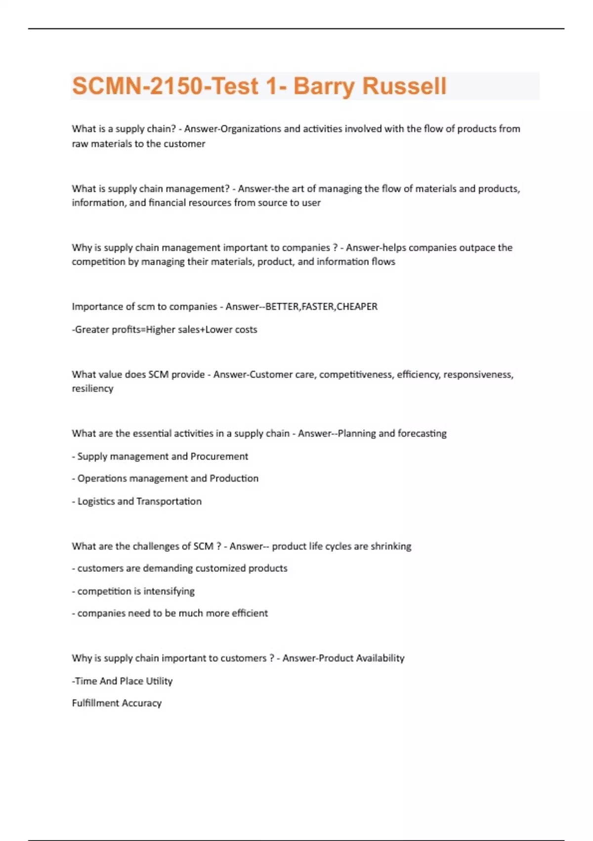 What is a supply chain? - Answer-Organizations and activities involved with the flow of products from raw materials to the customer What is supply chain management? - Answer-the art of managing the flow of materials and products, information, and financial resources from source to user Why is supply chain management important to companies ? - Answer-helps companies outpace the competition by managing their materials, product, and information flows Importance of scm to companies - Answer--BETTER,FASTER,CHEAPER -Greater profits=Higher sales+Lower costs What value does SCM provide - Answer-Customer care, competitiveness, efficiency, responsiveness, resiliency What are the essential activities in a supply chain - Answer--Planning and forecasting - Supply management and Procurement - Operations management and Production - Logistics and Transportation What are the challenges of SCM ? - Answer-- product life cycles are shrinking - customers are demanding customized products - competition is intensifying - companies need to be much more efficient Why is supply chain important to customers ? - Answer-Product Availability -Time And Place Utility Fulfillment AccuracySeven Rights - Answer-- Right Product - Right Customer - Right Time - Right Place - Right Condition - Right Quantity - Right Cost Who is the most important participant of a supply chain? - Answer-The consumer What companies have the top supply chains - Answer-Cisco---Johnson & Johnson---Colgate-Palmolive What are the three key flows of a supply chain - Answer-1.Product 2.Information 3.Money What is the logistics network ? - Answer-The process or system of an organization that work together to design, produce, and deliver a service to a market what are nodes - Answer-nodes- fixed point like a warehouses or distribution center.Goods are processed, transformed, mixed, held, or sold at nodes. What are the benefits of a Centralized supply chain network? - Answer--Lower inventory & safety stock levels - Better visablitity - Lower overhead stock - Less labor - Smaller management team economies of scaleWhat is a link - Answer-transportation method used to connect the nodes