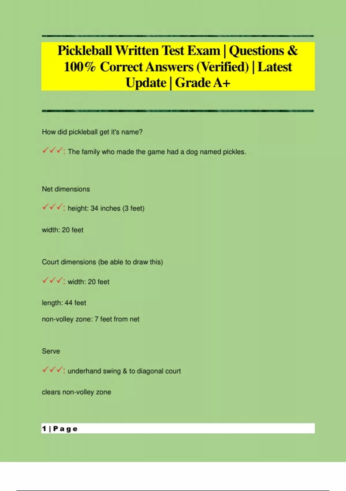 Pickleball Written Test Exam | Questions & 100% Correct Answers (Verified) | Latest Update | Grade A+