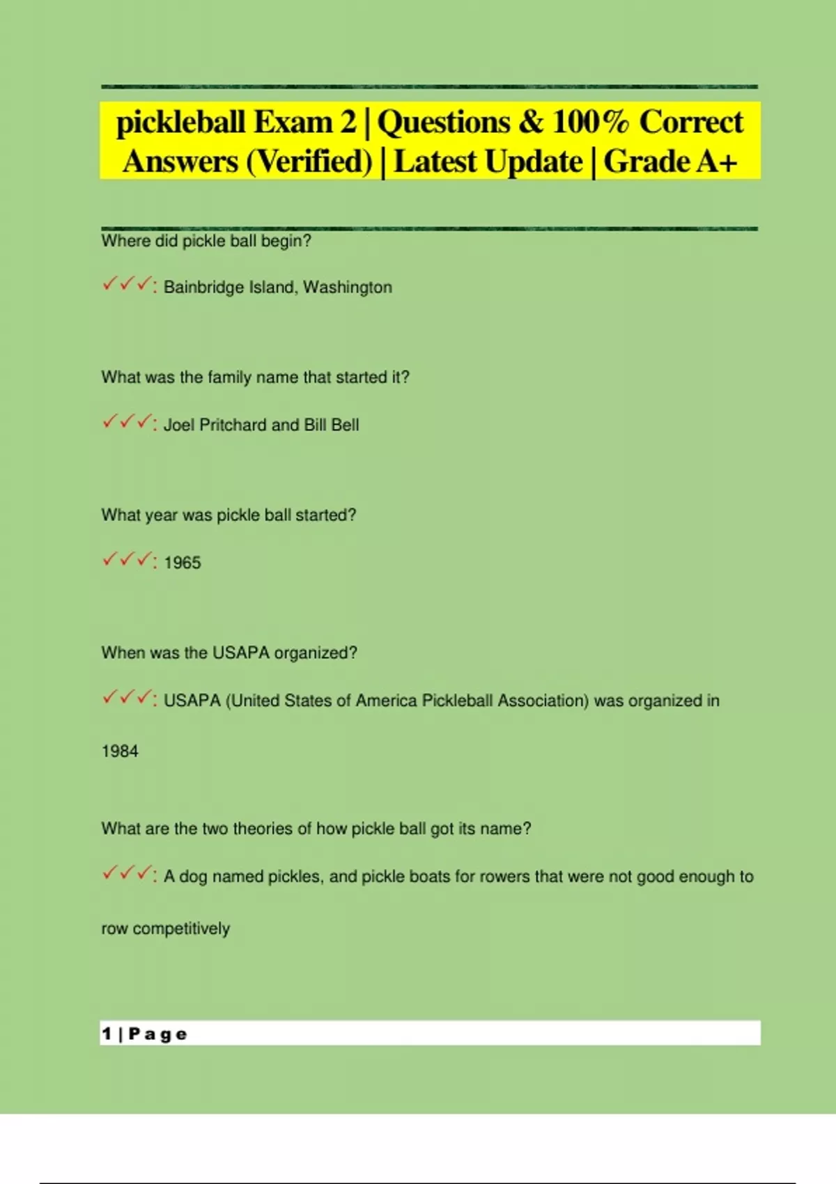 pickleball Exam 2 | Questions & 100% Correct Answers (Verified) | Latest Update | Grade A+