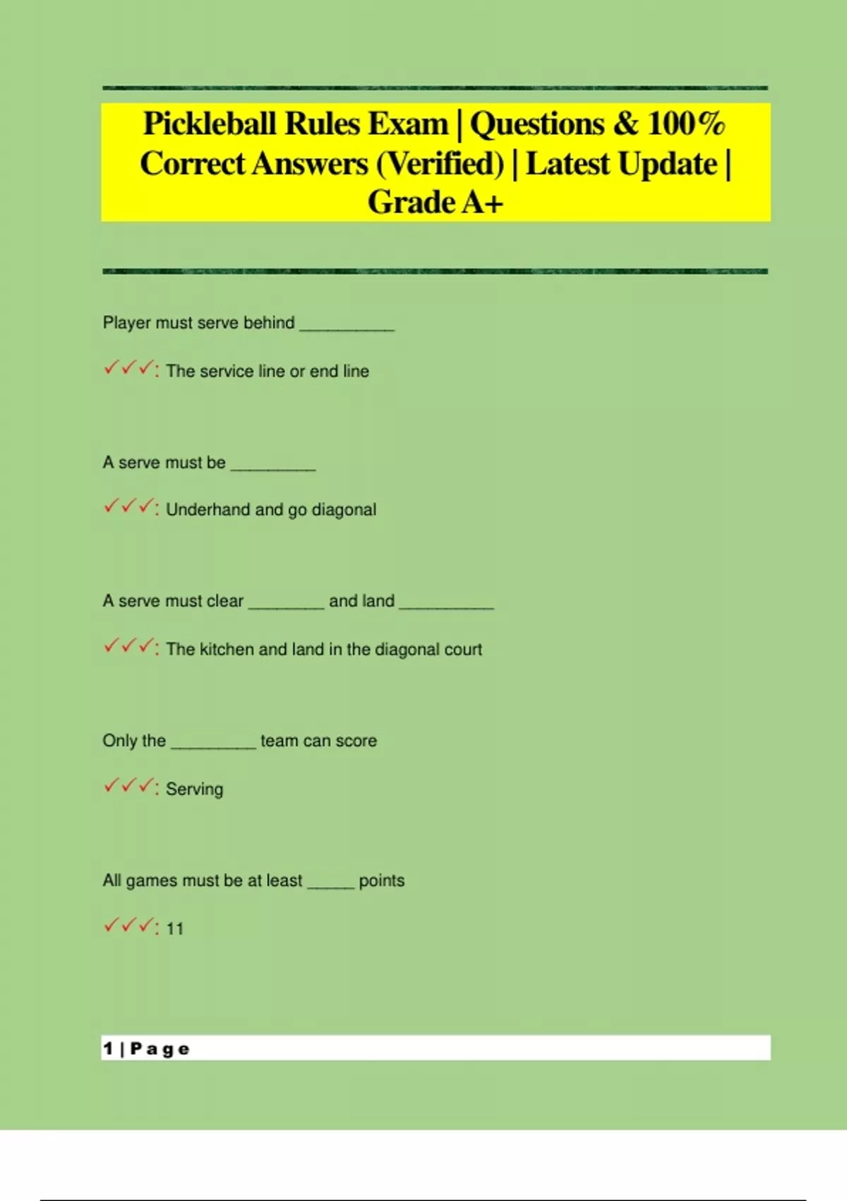 Pickleball Rules Exam | Questions & 100% Correct Answers (Verified) | Latest Update | Grade A+