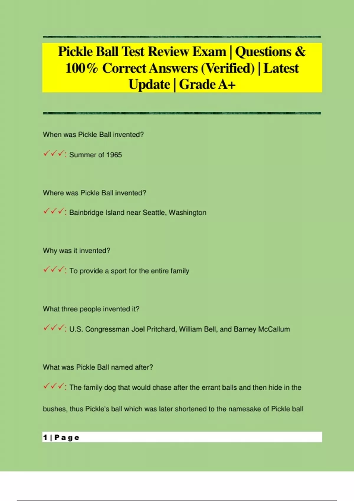 Pickle Ball Test Review Exam | Questions & 100% Correct Answers (Verified) | Latest Update | Grade A+
