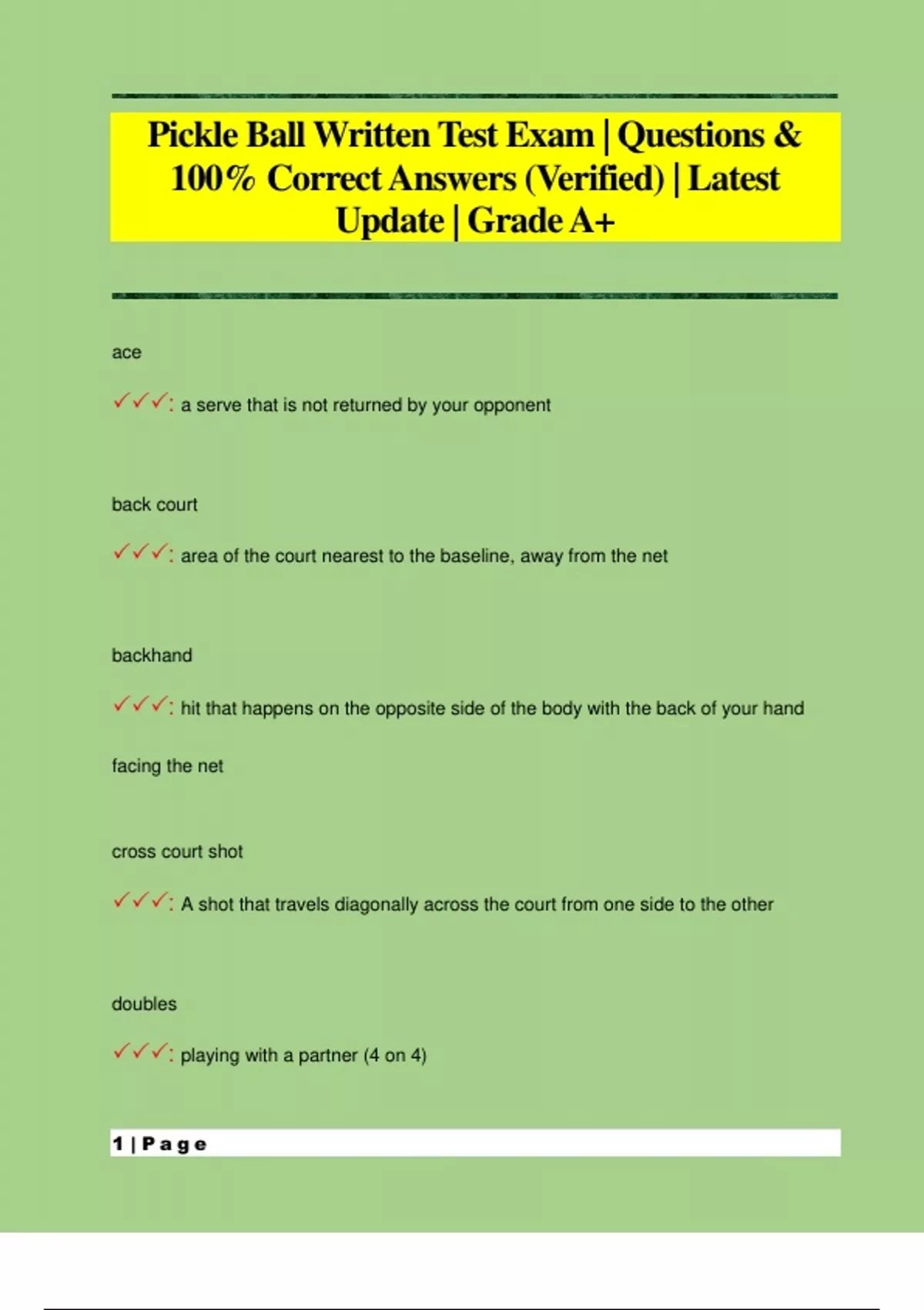 Pickle Ball Written Test Exam | Questions & 100% Correct Answers (Verified) | Latest Update | Grade A+