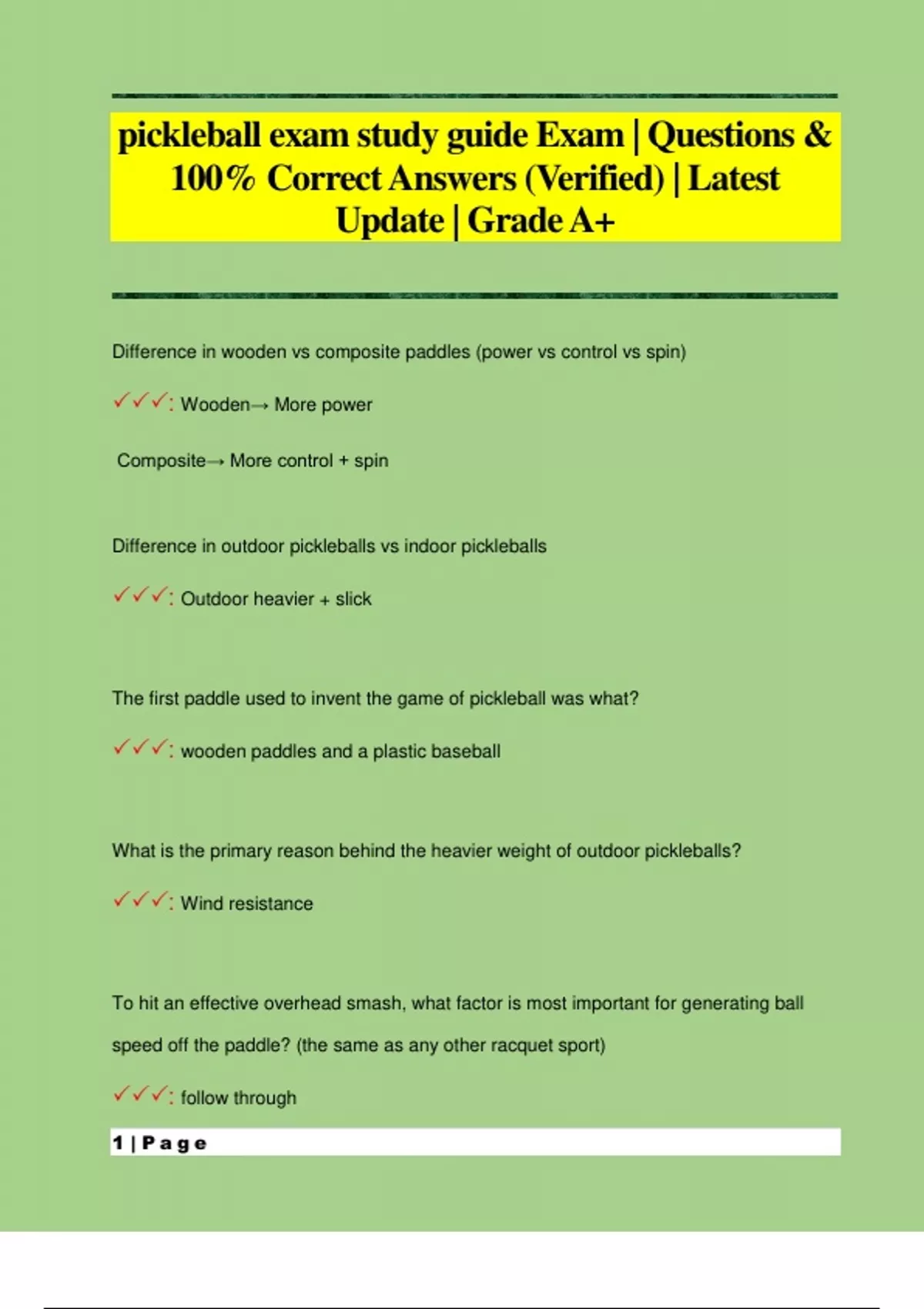 pickleball exam study guide Exam | Questions & 100% Correct Answers (Verified) | Latest Update | Grade A+