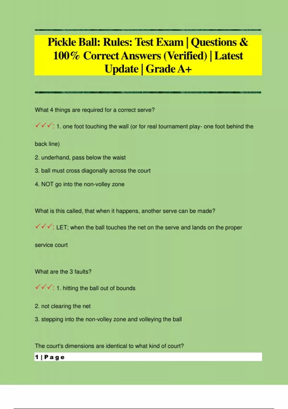 Pickle Ball: Rules: Test Exam | Questions & 100% Correct Answers (Verified) | Latest Update | Grade A+