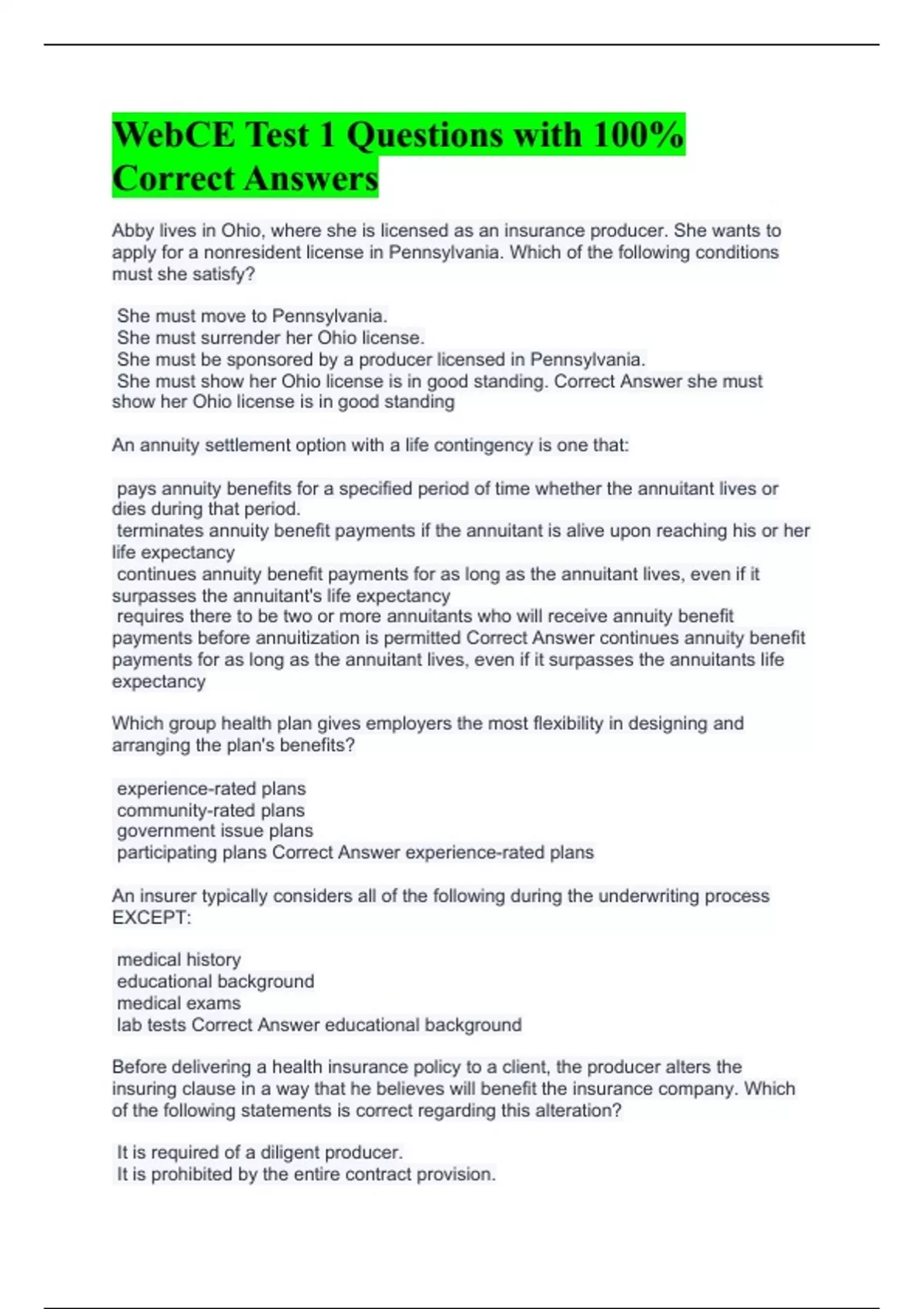 Abby lives in Ohio, where she is licensed as an insurance producer. She wants to apply for a nonresident license in Pennsylvania. Which of the following conditions must she satisfy? She must move to Pennsylvania. She must surrender her Ohio license. She must be sponsored by a producer licensed in Pennsylvania. She must show her Ohio license is in good standing. Correct Answer she must show her Ohio license is in good standing An annuity settlement option with a life contingency is one that: pays annuity benefits for a specified period of time whether the annuitant lives or dies during that period. terminates annuity benefit payments if the annuitant is alive upon reaching his or her life expectancy continues annuity benefit payments for as long as the annuitant lives, even if it surpasses the annuitant's life expectancy requires there to be two or more annuitants who will receive annuity benefit payments before annuitization is permitted Correct Answer continues annuity benefit payments for as long as the annuitant lives, even if it surpasses the annuitants life expectancy Which group health plan gives employers the most flexibility in designing and arranging the plan's benefits? experience-rated plans community-rated plans government issue plans participating plans Correct Answer experience-rated plans An insurer typically considers all of the following during the underwriting process EXCEPT: medical history educational background medical exams lab tests Correct Answer educational background Before delivering a health insurance policy to a client, the producer alters the insuring clause in a way that he believes will benefit the insurance company. Which of the following statements is correct regarding this alteration? It is required of a diligent producer. It is prohibited by the entire contract provision. It is permitted only when it is in the insurer's best interests. It is prohibited unless the insured agrees to it in writing. Correct Answer it is prohibited by the entire contract provision Terry, Bella, Raul, and Paulina each own a whole life insurance policy. Which person would not be able to accelerate the benefits under their policy? Terry, who has cancer and a six-month life expectancy Bella, who has multiple sclerosis Raul, who became permanently disabled following a work accident Paulina, who was injured in a car accident but is expected to return to work in a month Correct Answer Paulina, who was injured in a car accident but is expected to return to work in a month Horace buys a Medicare supplement insurance policy but decides not to keep it. How many days does he have to return it for a full refund of the premium? 10 14 21 30 Correct Answer 30 Medicare has a free-look period of 30 days All of the following statements about annuities are generally correct, EXCEPT: Annuities are not life insurance. Annuities are sold by life insurance agents and are issued by life insurance companies. The historic purpose of annuities is to create estates over a certain period. An annuity converts a sum of money into a series of income payments. Correct Answer the historic purpose of annuities is to create estates over a certain period If a retired worker's total combined income, including one-half of his or her Social Security benefit, exceeds a threshold amount, then up to what percentage of benefits exceeding the threshold are taxable? 0 percent 50 percent 85 percent 100 percent Correct Answer 85% Gene is injured while on vacation. His employer's group disability plan pays benefits for over two years but reduces the amount paid by the benefits he receives under an individual disability policy. What kind of group coverage does Gene have? group short-term disability plan group occupational plan group long-term disability plan group partial disability plan Correct Answer group long-term disability plan