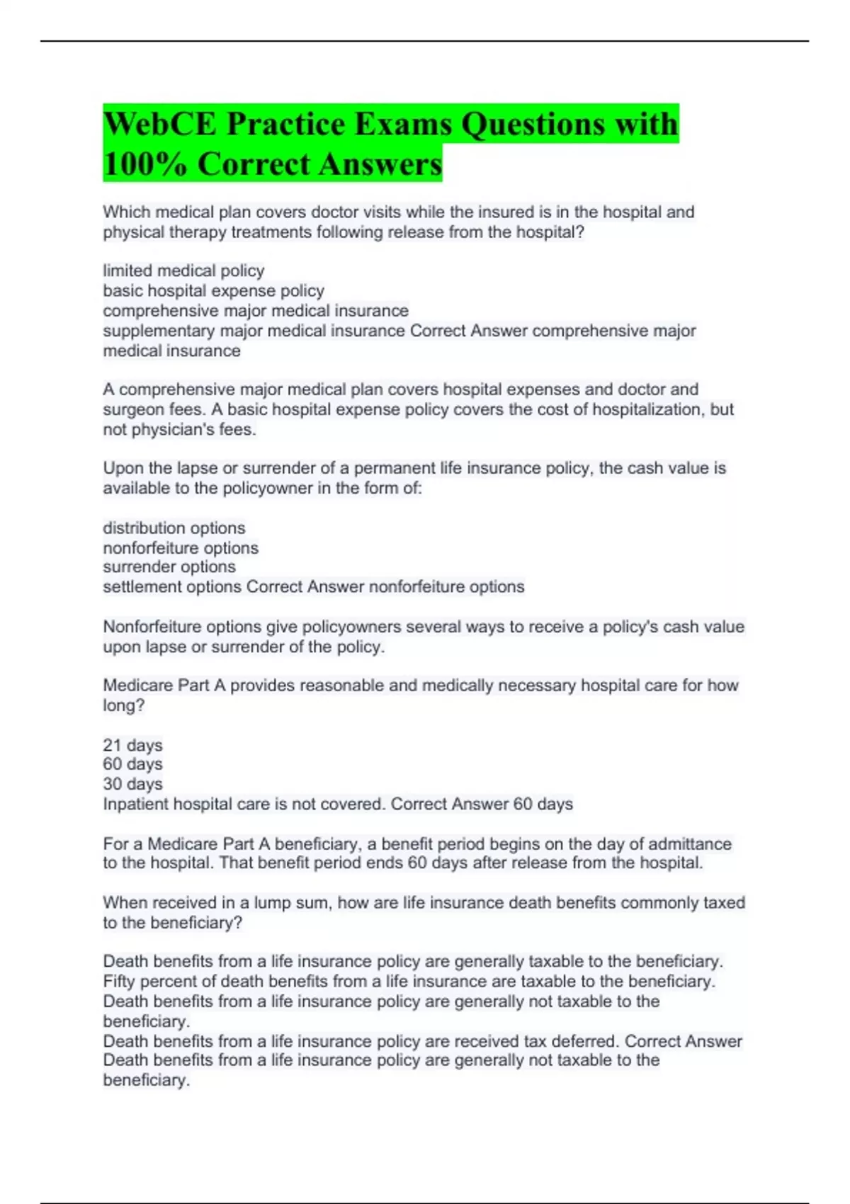 Which medical plan covers doctor visits while the insured is in the hospital and physical therapy treatments following release from the hospital? limited medical policy basic hospital expense policy comprehensive major medical insurance supplementary major medical insurance Correct Answer comprehensive major medical insurance A comprehensive major medical plan covers hospital expenses and doctor and surgeon fees. A basic hospital expense policy covers the cost of hospitalization, but not physician's fees. Upon the lapse or surrender of a permanent life insurance policy, the cash value is available to the policyowner in the form of: distribution options nonforfeiture options surrender options settlement options Correct Answer nonforfeiture options Nonforfeiture options give policyowners several ways to receive a policy's cash value upon lapse or surrender of the policy. Medicare Part A provides reasonable and medically necessary hospital care for how long? 21 days 60 days 30 days Inpatient hospital care is not covered. Correct Answer 60 days For a Medicare Part A beneficiary, a benefit period begins on the day of admittance to the hospital. That benefit period ends 60 days after release from the hospital. When received in a lump sum, how are life insurance death benefits commonly taxed to the beneficiary? Death benefits from a life insurance policy are generally taxable to the beneficiary. Fifty percent of death benefits from a life insurance are taxable to the beneficiary. Death benefits from a life insurance policy are generally not taxable to the beneficiary. Death benefits from a life insurance policy are received tax deferred. Correct Answer Death benefits from a life insurance policy are generally not taxable to the beneficiary. When received in a lump sum, the death benefits from a life insurance policy are generally not taxable to the beneficiary. For tax purposes, the term "self-employed person" includes all of the following, EXCEPT: a sole proprietor a C corporation's officers a partner an S corporation owner who owns more than 2 percent of the outstanding shares Correct Answer a C corporation's officers A pregnant woman marries and is covered by her spouse's employer's group health plan. Will the plan cover the child? Yes, after the woman applies for coverage on behalf of the child. Yes, from the moment of birth. No, because the pregnancy was a pre-existing condition. No, because dependents must be covered under a separate policy. Correct Answer Yes, from the moment of birth. HMOs must provide their subscribers (enrollees) with evidence of coverage, which must include all the following EXCEPT the HMO's contact information a list of all approved medical care providers in the HMO's network a description of the coverage provided by the plan an explanation of the capitation arrangement the HMO has with providers in its network Correct Answer a list of all approved medical care providers in the HMO's network On June 1, Sandra submitted proof of her uncle's death and her right as beneficiary to receive the proceeds of his life insurance policy. A life insurance policy settlement must take place by: July 1 June 15 August 1 December 31 Correct Answer August 1 A policy settlement must take place no later than two months after the date of receipt of proof of the insured's death and the right of the claimant to the policy proceeds. Which of the following types of health insurance covers the cost of medical care and medical services? disability income insurance medical expense insurance accidental death and dismemberment (AD&D) insurance